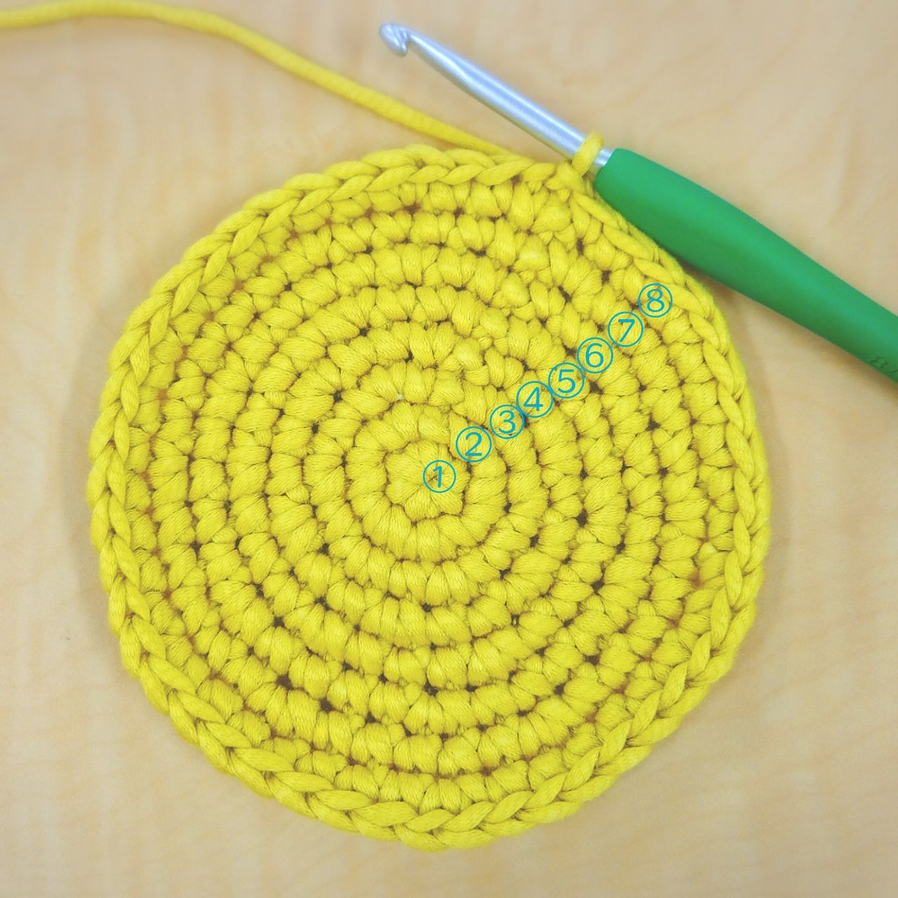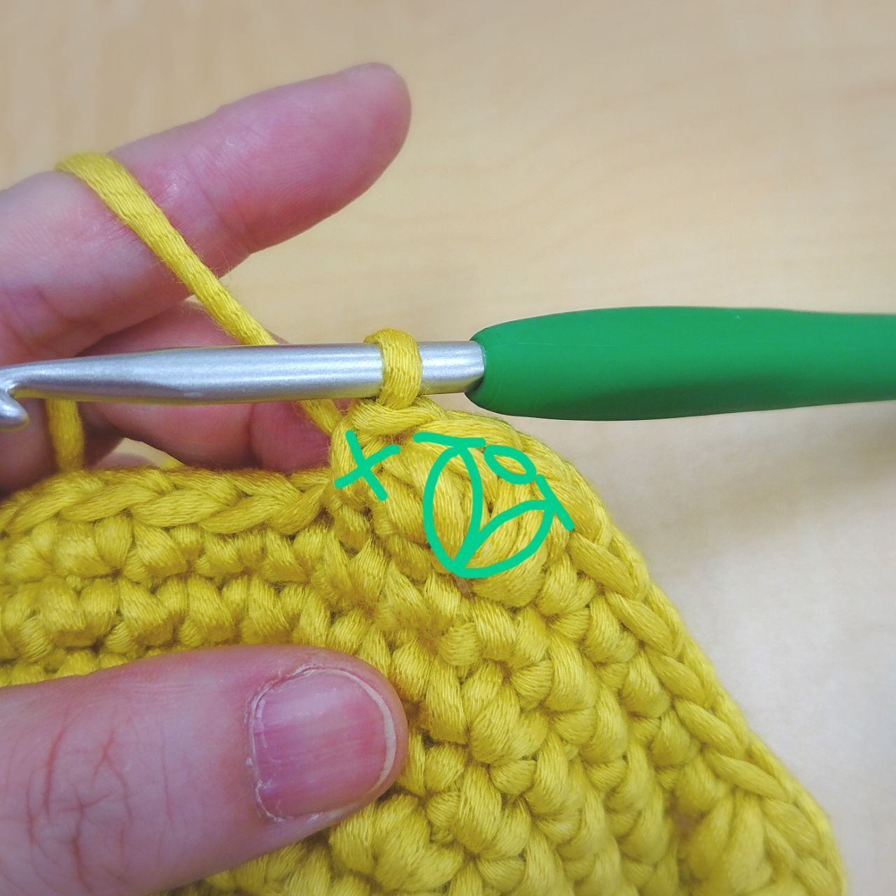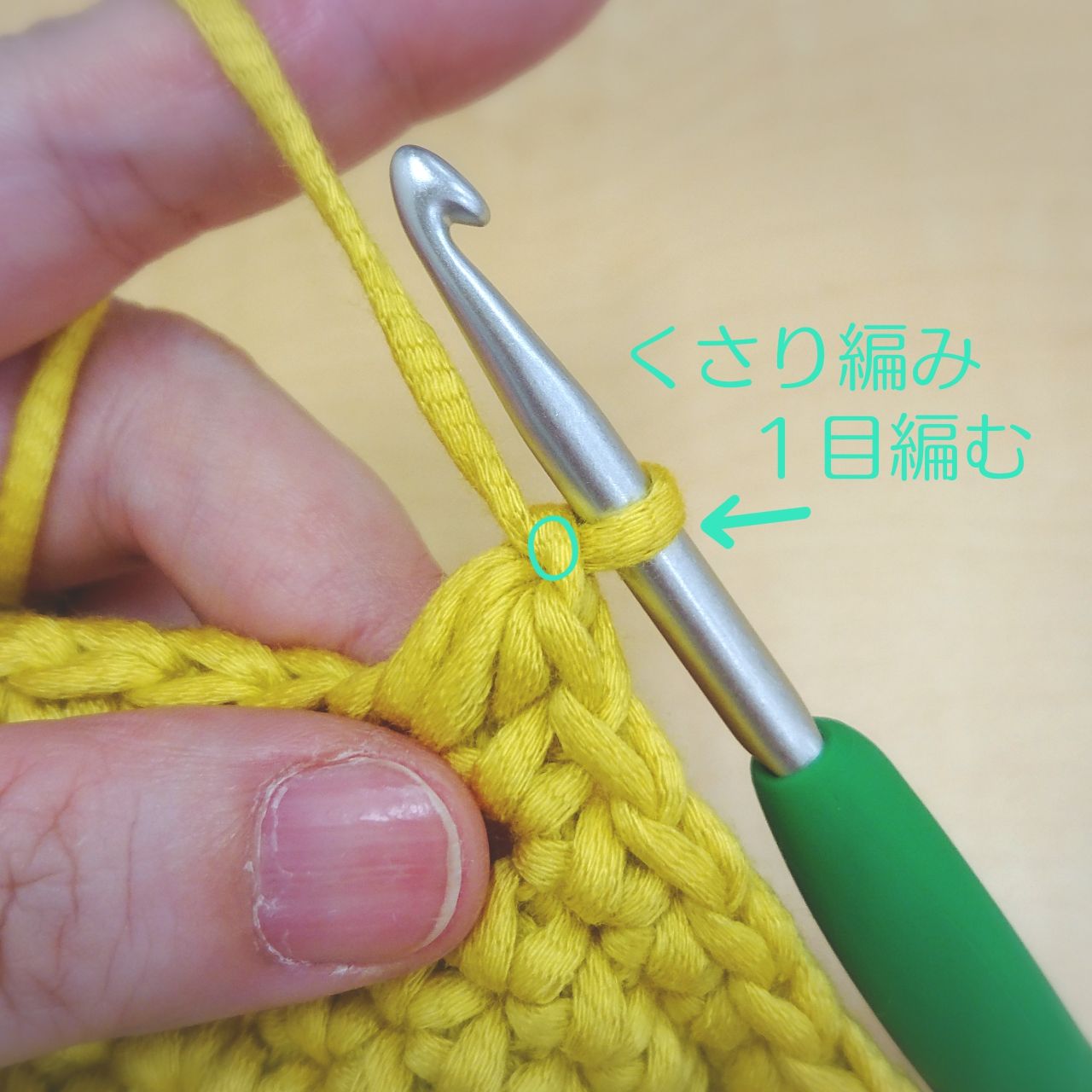 糸の色を変えて、ひも通し部分から編みはじめ、続けて葉っぱ部分まで編みます。