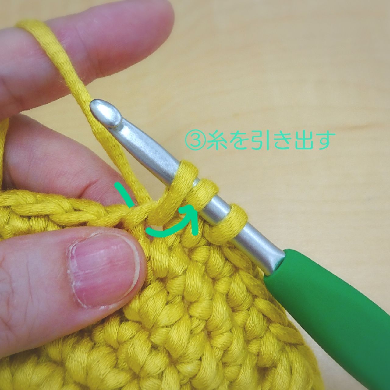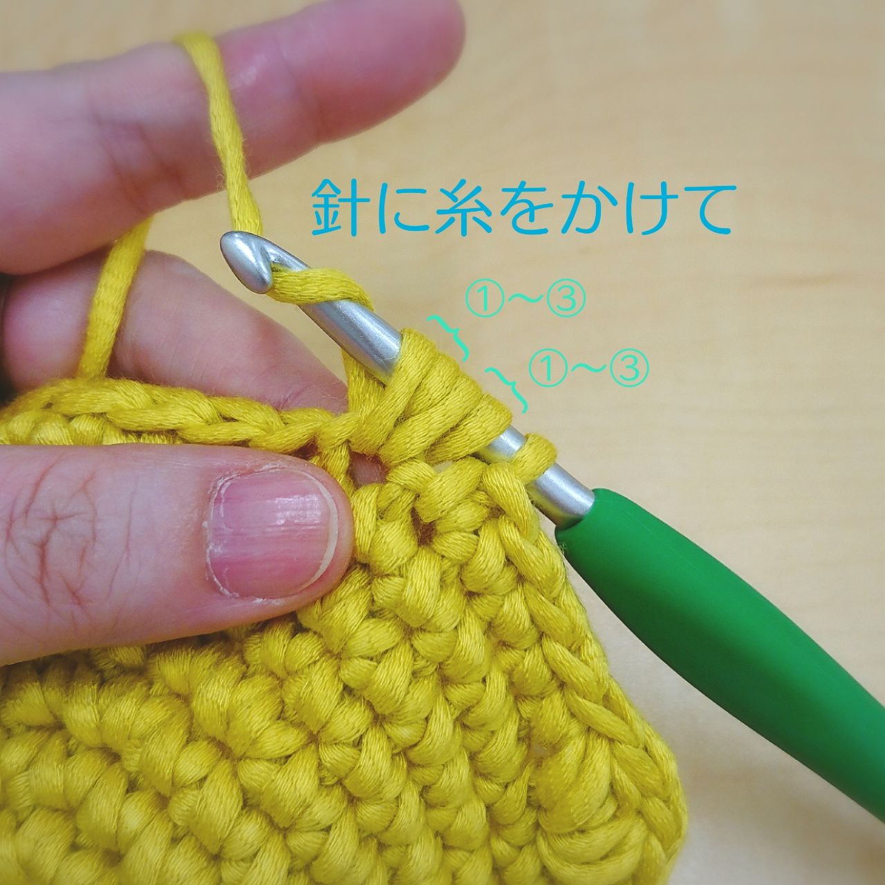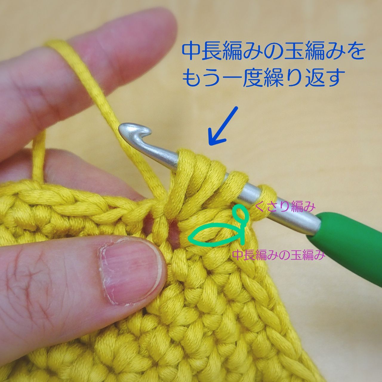 通常の中長編みの、最後に糸を引き出す手前までを2回繰り返したら、