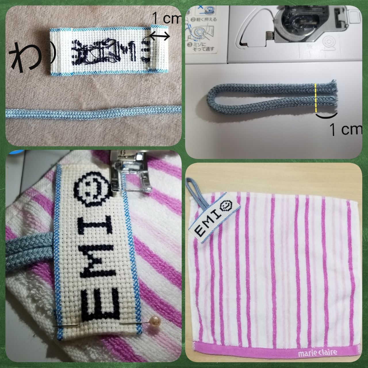 ひもをコットンテープに挟み、タオルに縫い付けます