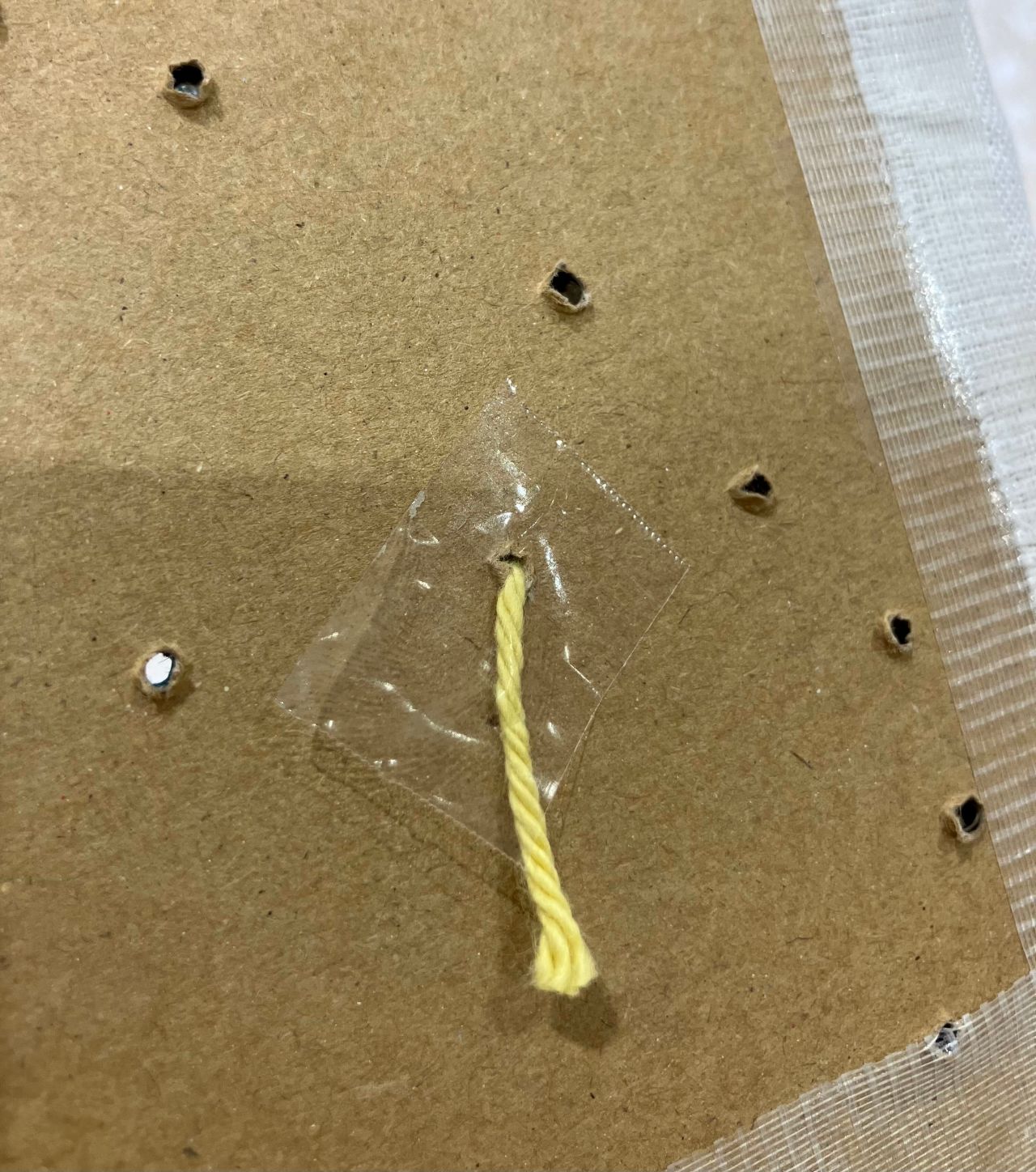 針があたるとベタつくので、端っこに貼れるとよいです。セロハンテープなどで仮止めして、養生テープで貼り付けました。写真は仮止めのセロハンテープの状態です。