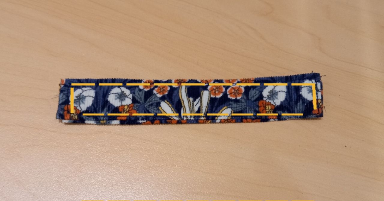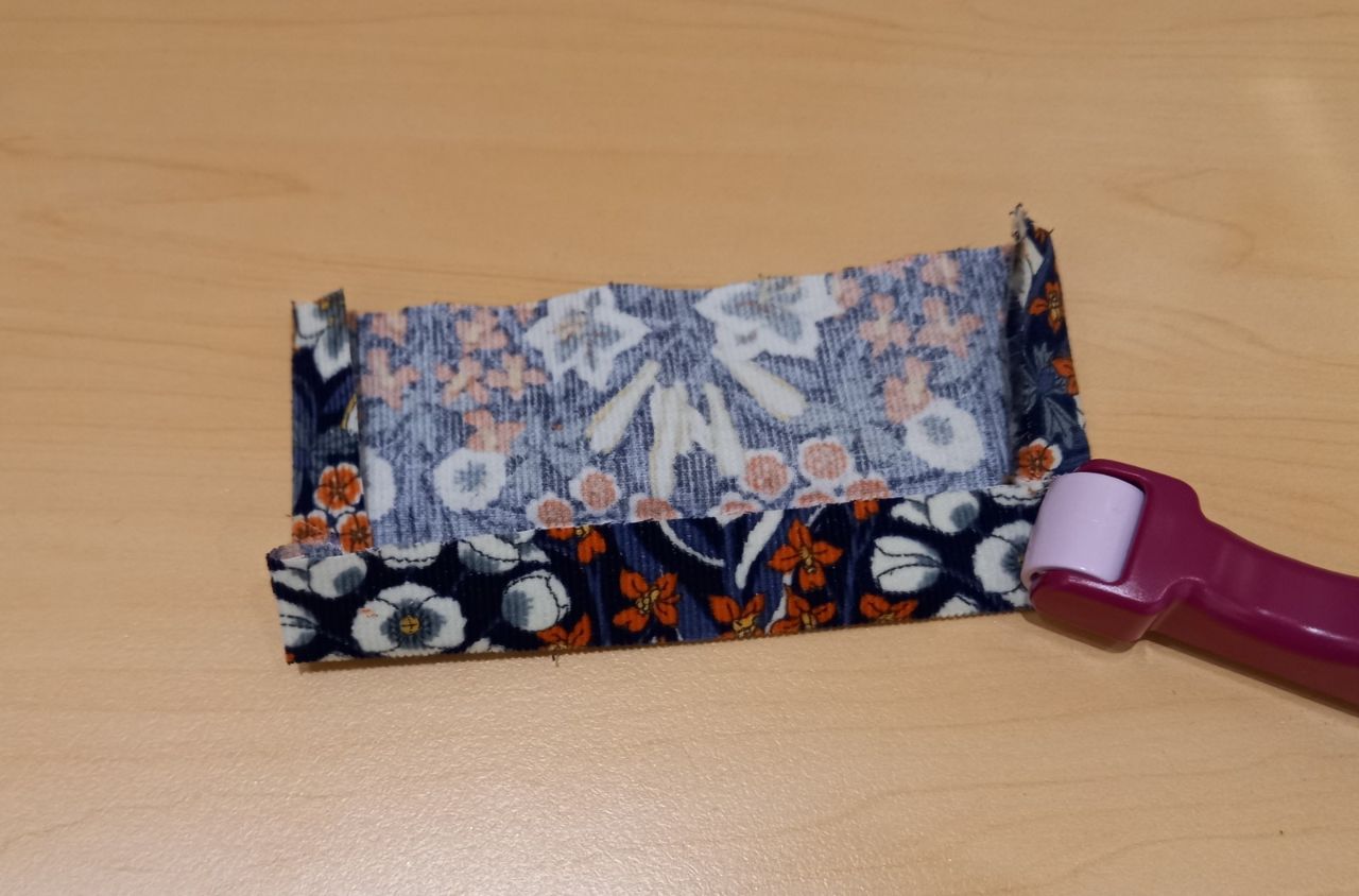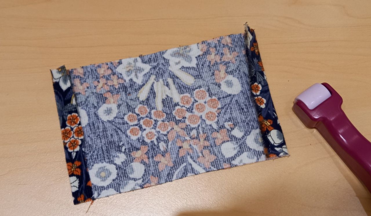 ①まず、生地を縦8cm×横15cmに裁断し、脇を1cmずつ内側に折りアイロンをかけます。