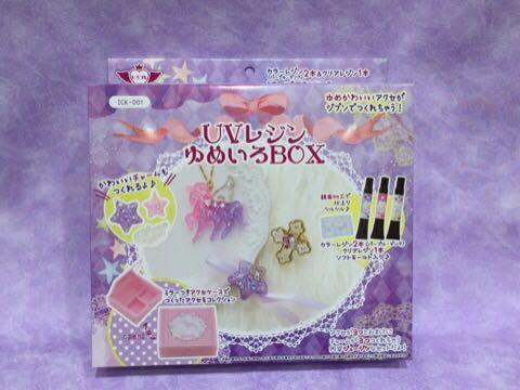 UVレジンゆめいろBOXにはカラーレジン(ピンク&パープル)、クリアーレジン、ソフトモールド「ユニコーンスター」、アクセサリーパーツ、さらにミラー付きアクセケースも入っています。