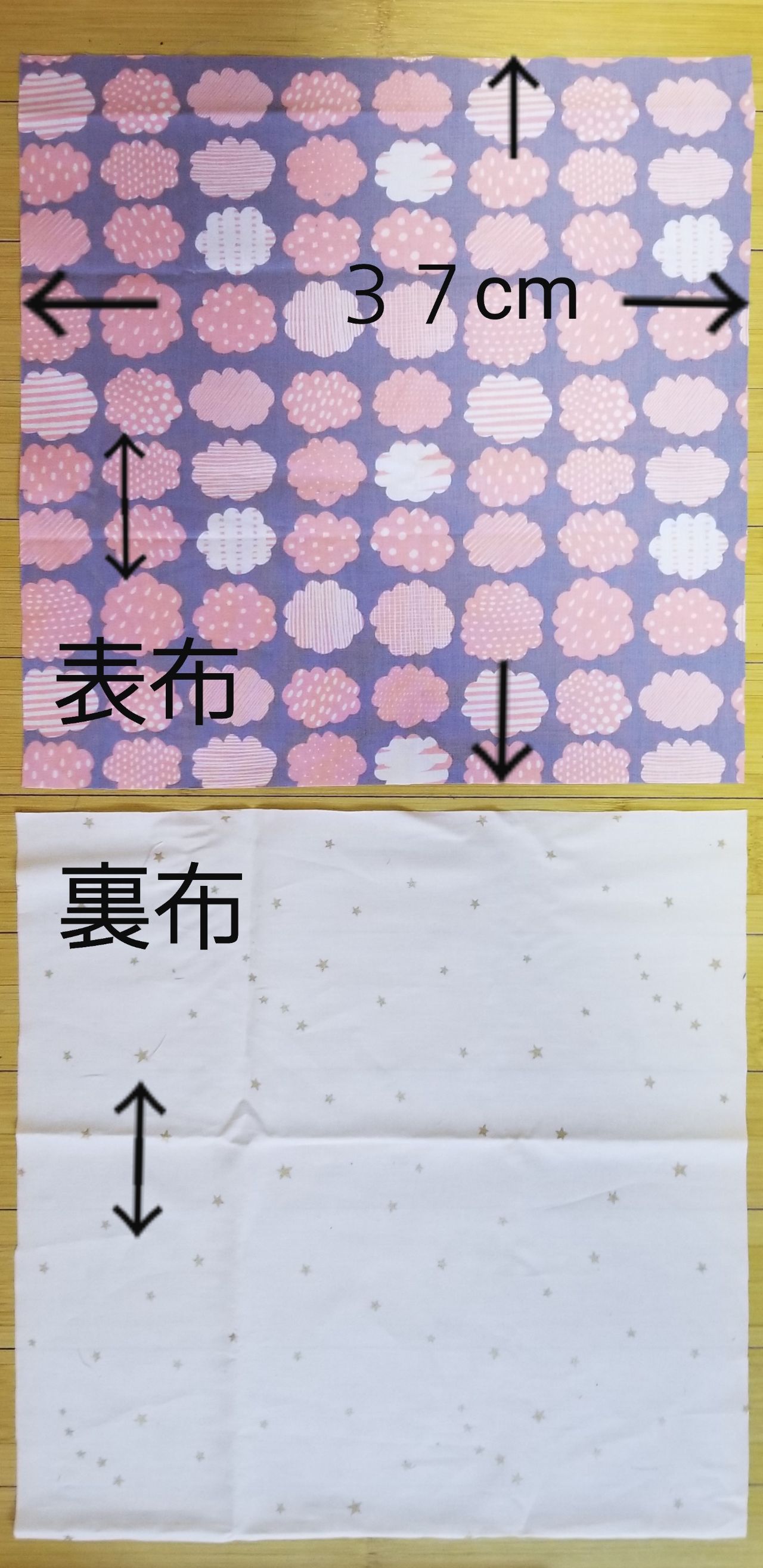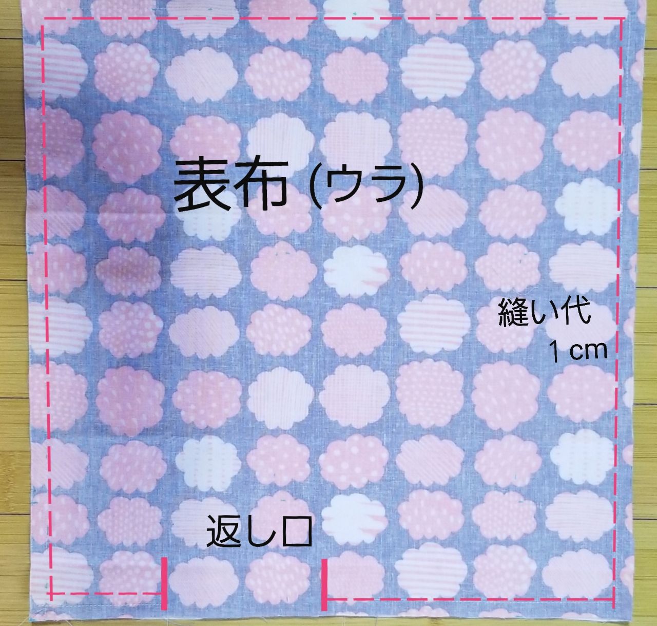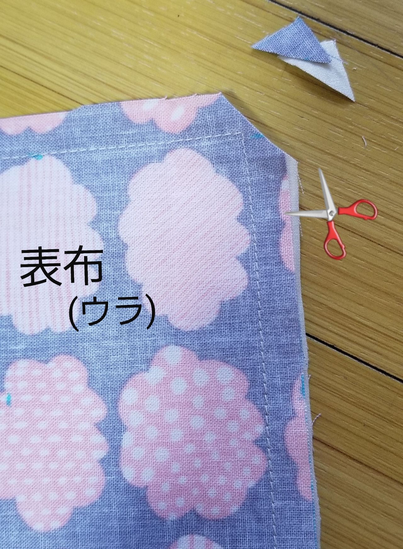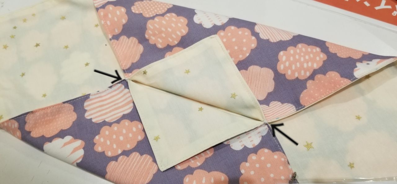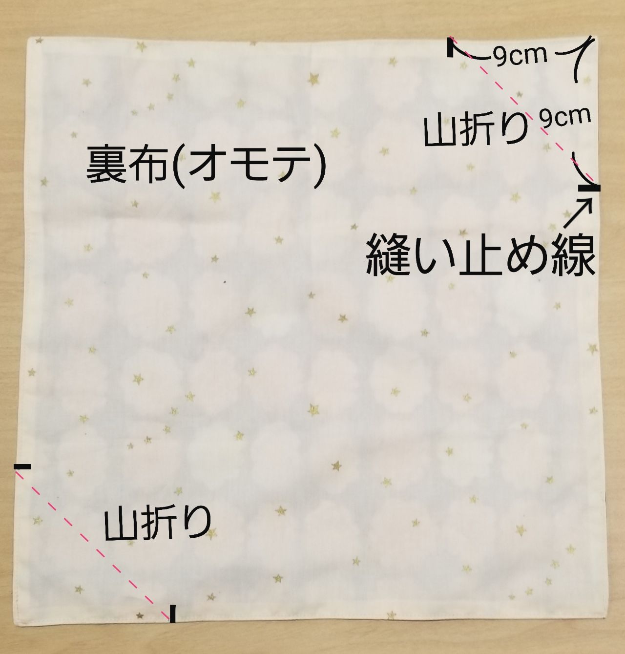 ⑤対面の角9cmに縫い止め線印をつけ、山折りしたら