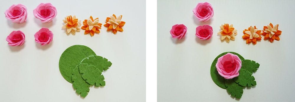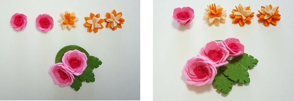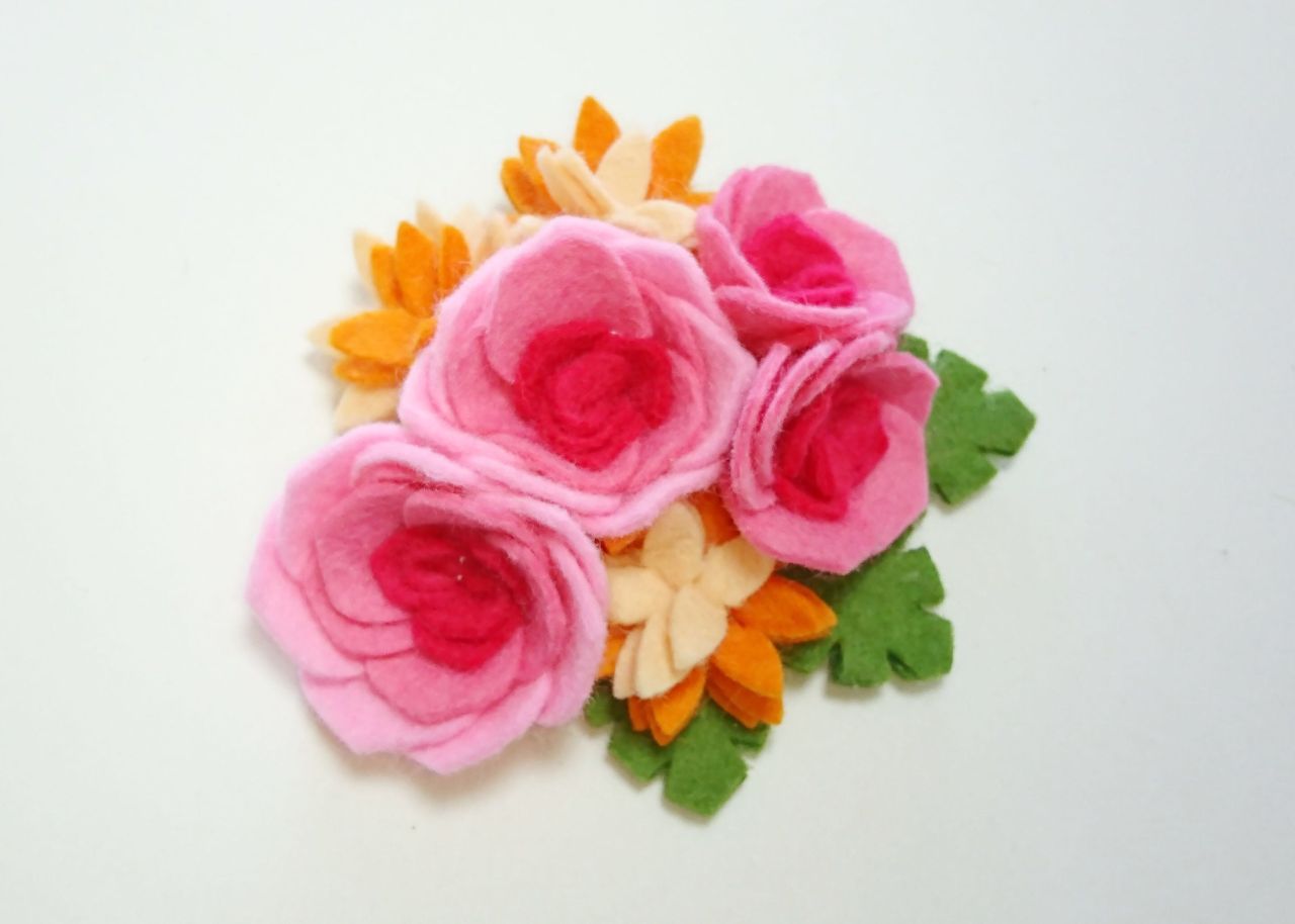 ビオラは花の形のフェルト重ねて作ります。こちらもわりと簡単なレベルだと思います。