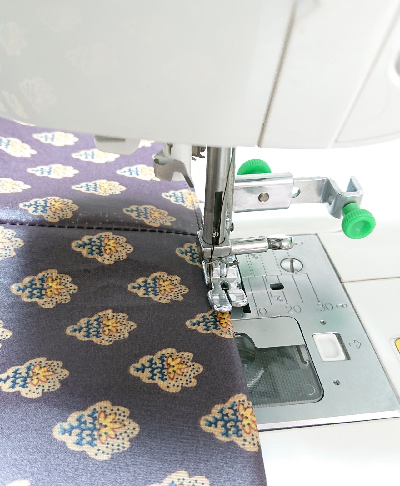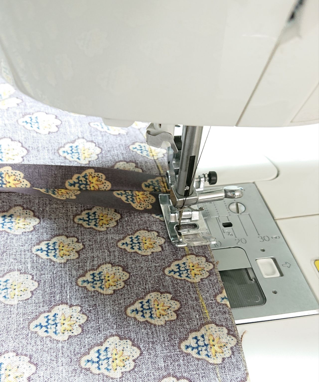 ⑥返し口から表にひっくり返し、見返しを3cmに整えて、2mm内側にステッチをかけます。