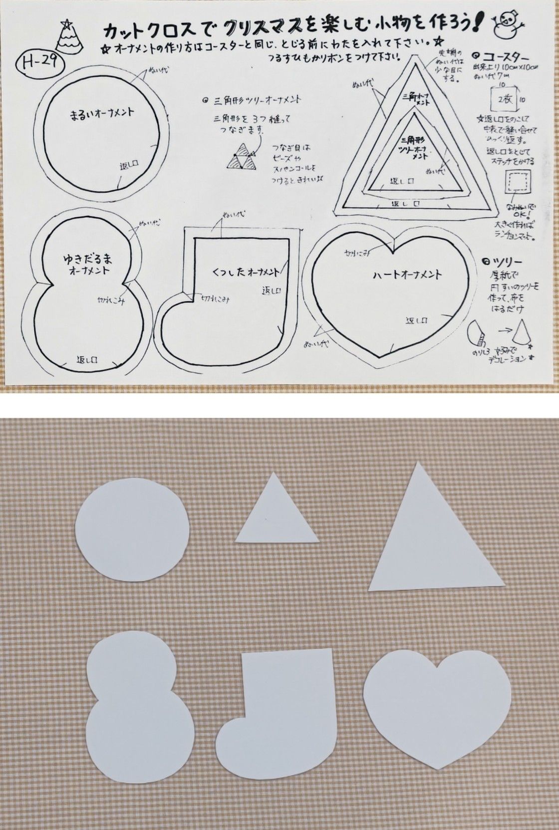 ①カットクロスで作るクリスマスオーナメントのレシピの型紙を出来上がり線でカットします。