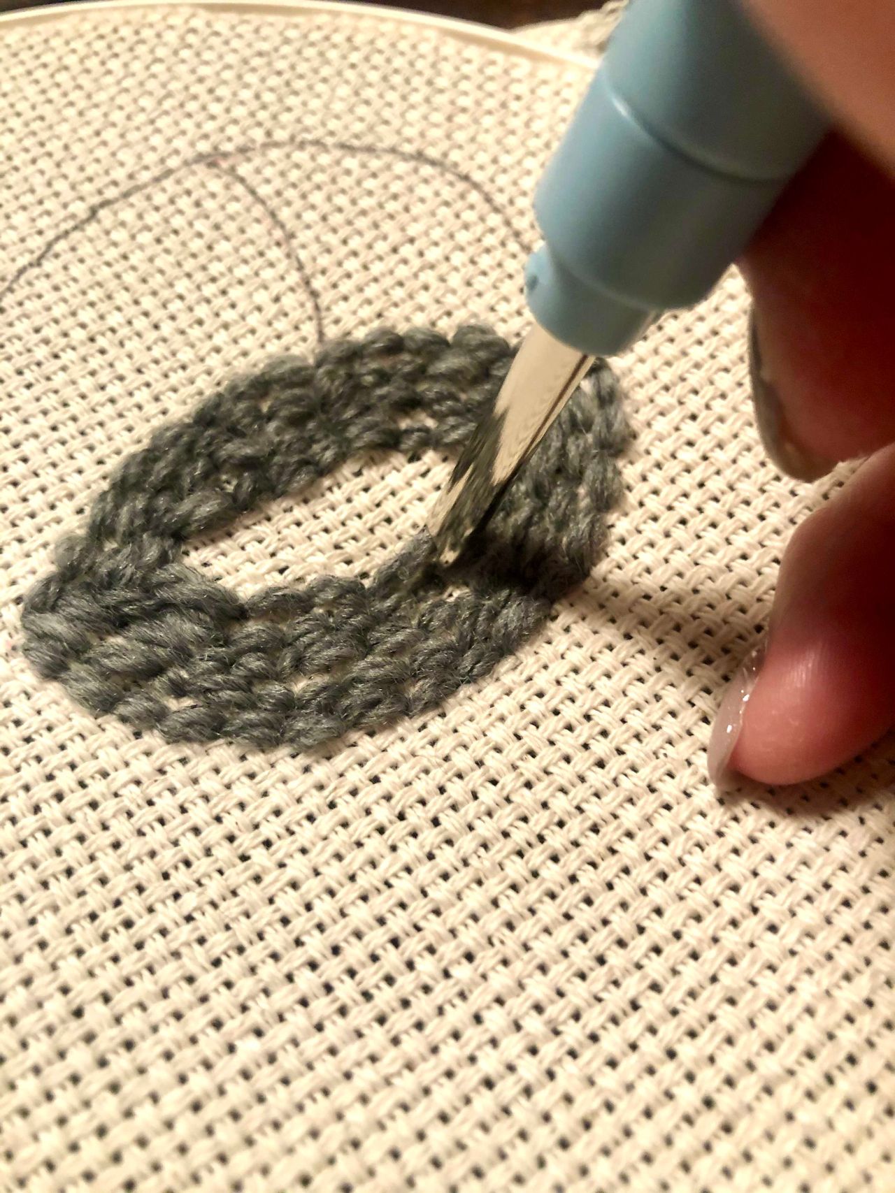 ◯図案をパンチニードル用ファブリックにトレースしたら、パンチニードルフープにしっかり張ります。