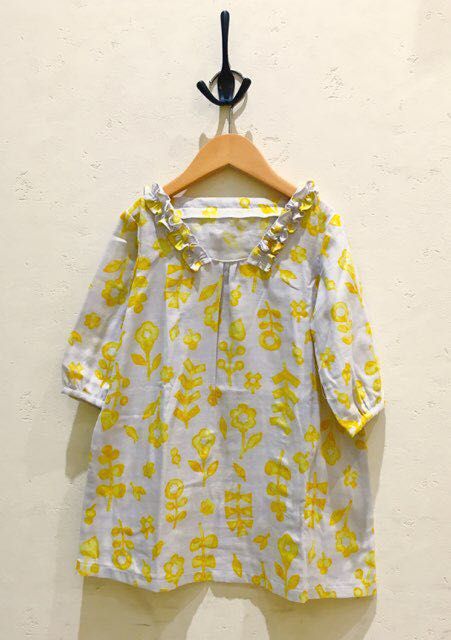 Pebble plantsの生地で作った、子供用のワンピースのサンプルを展示しております。