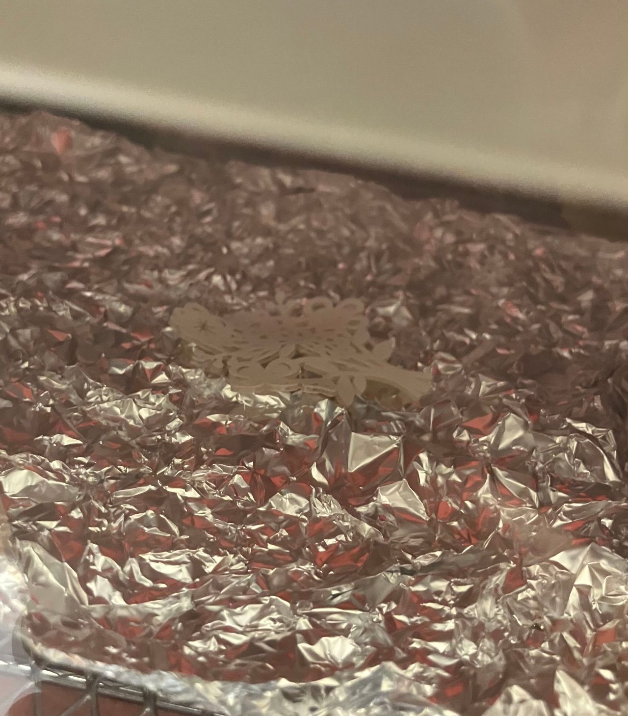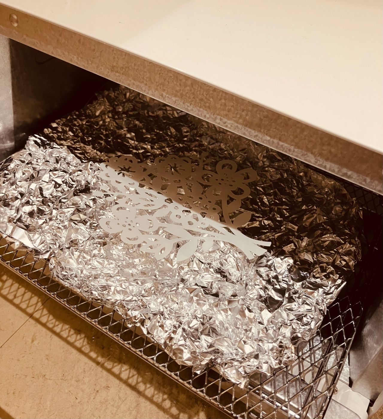 白色プラ板を使ったので、とくに色付けなどはせずこのままオーブントースターで加熱して縮めます。