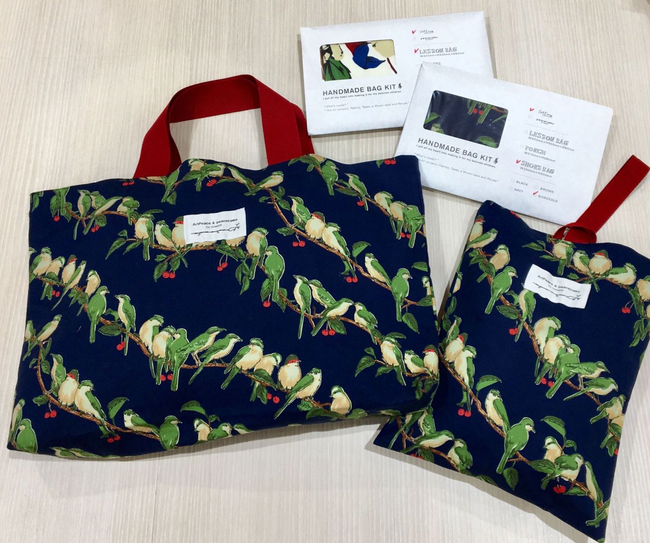 キットには 生地・付属テープ・パターン・織りネームが入っています。