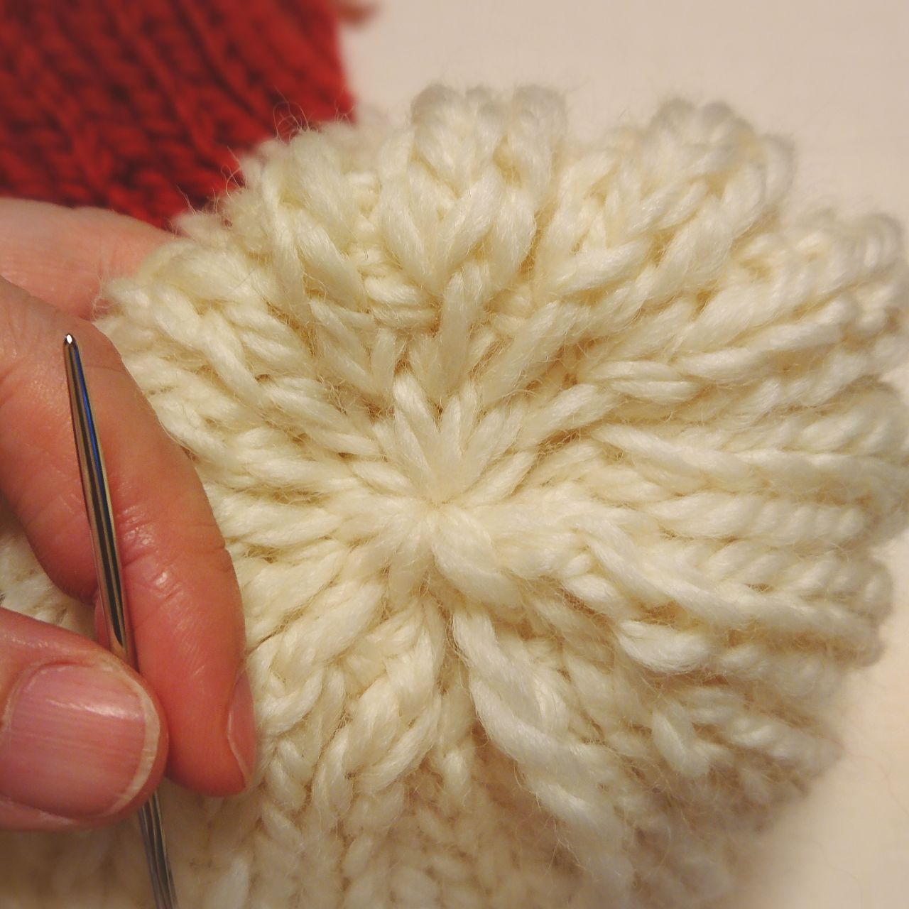 帽子の中心にポンポンを通して、内側で糸処理をします。