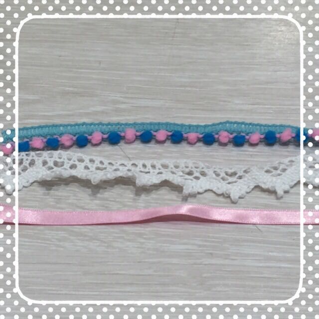 ①リボン、レース、ポンポンテープを3本合わせて揃える。