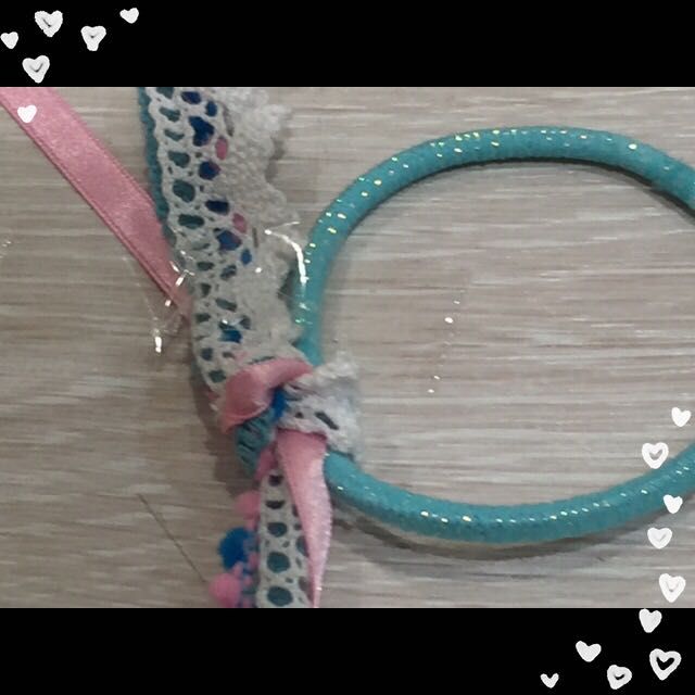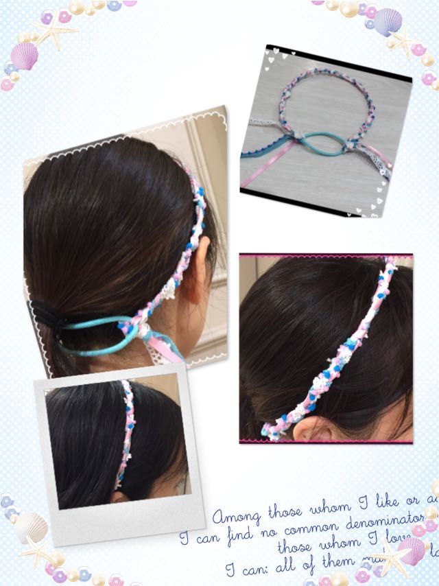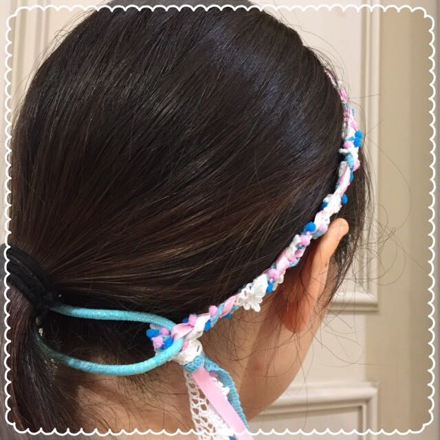 ④カチュームを頭に当ててみて、頭にフィットする位の大きさになるくらいで三つ編みをやめ、ゴムにとおして結ぶ。