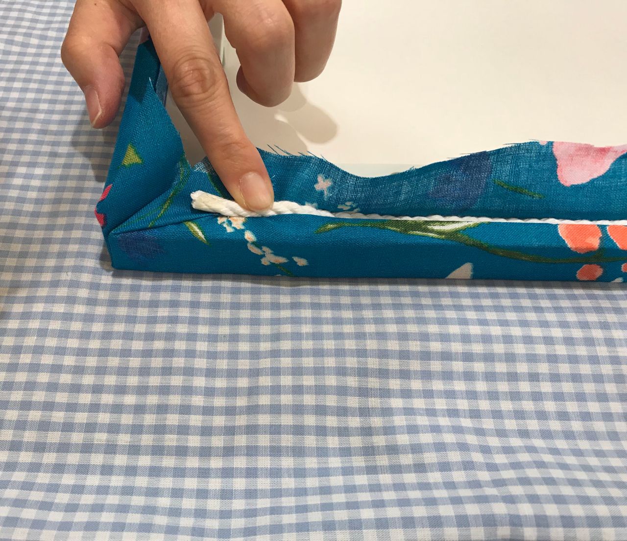すでに押し込んだひもの端を少し出して、余った生地を一緒に押し込むとスッキリと仕上がります。