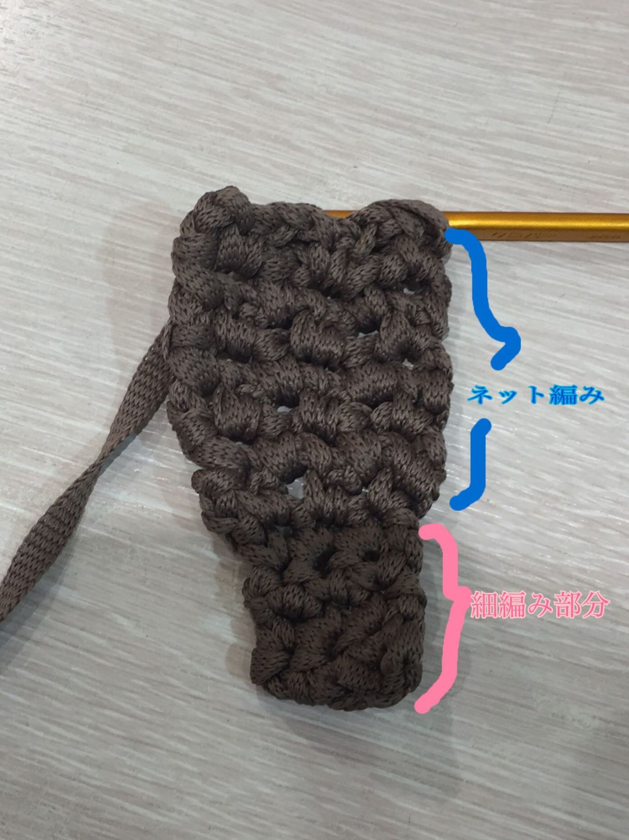 ③ 6段目からも②と同じように進め、ネット編みの部分がおおよそ46cmになるまであみ続けます。(長さは頭のサイズに応じて調整してください。)