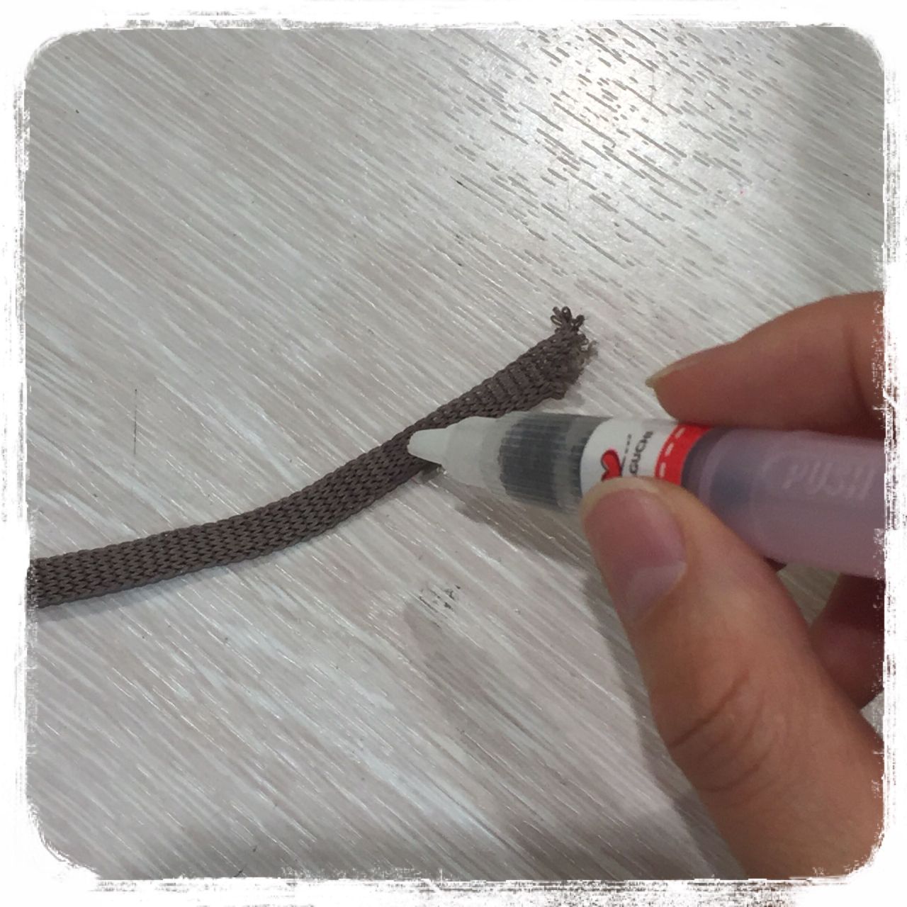 ①まず編むための準備としてプロムナードの糸端より少し手前にピケ(ほつれ止め)を塗って、ほつれにくくします。