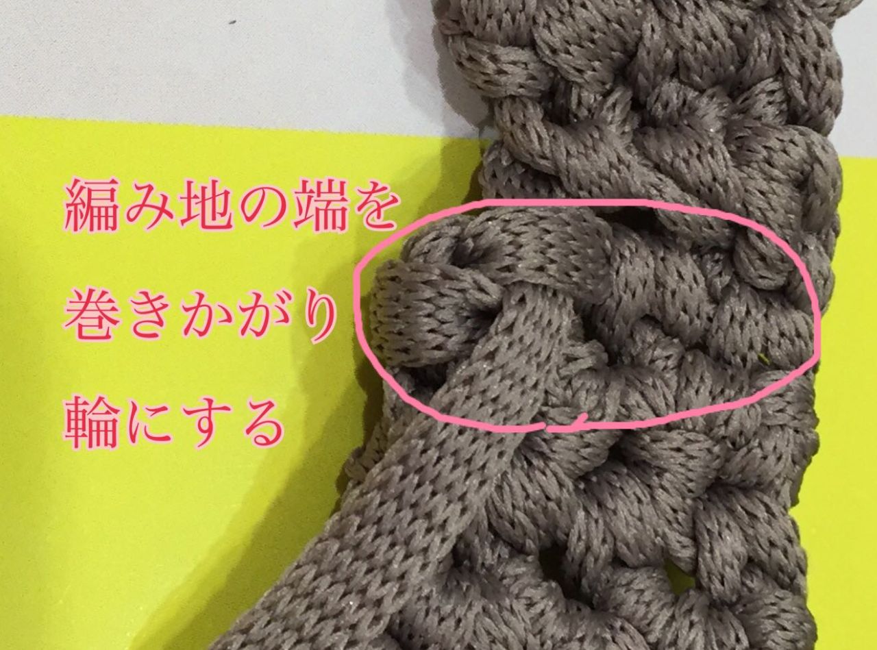 ネット編み部分の中央で1回ねじってから、残しておいた糸で巻きかがりをし、輪にします。