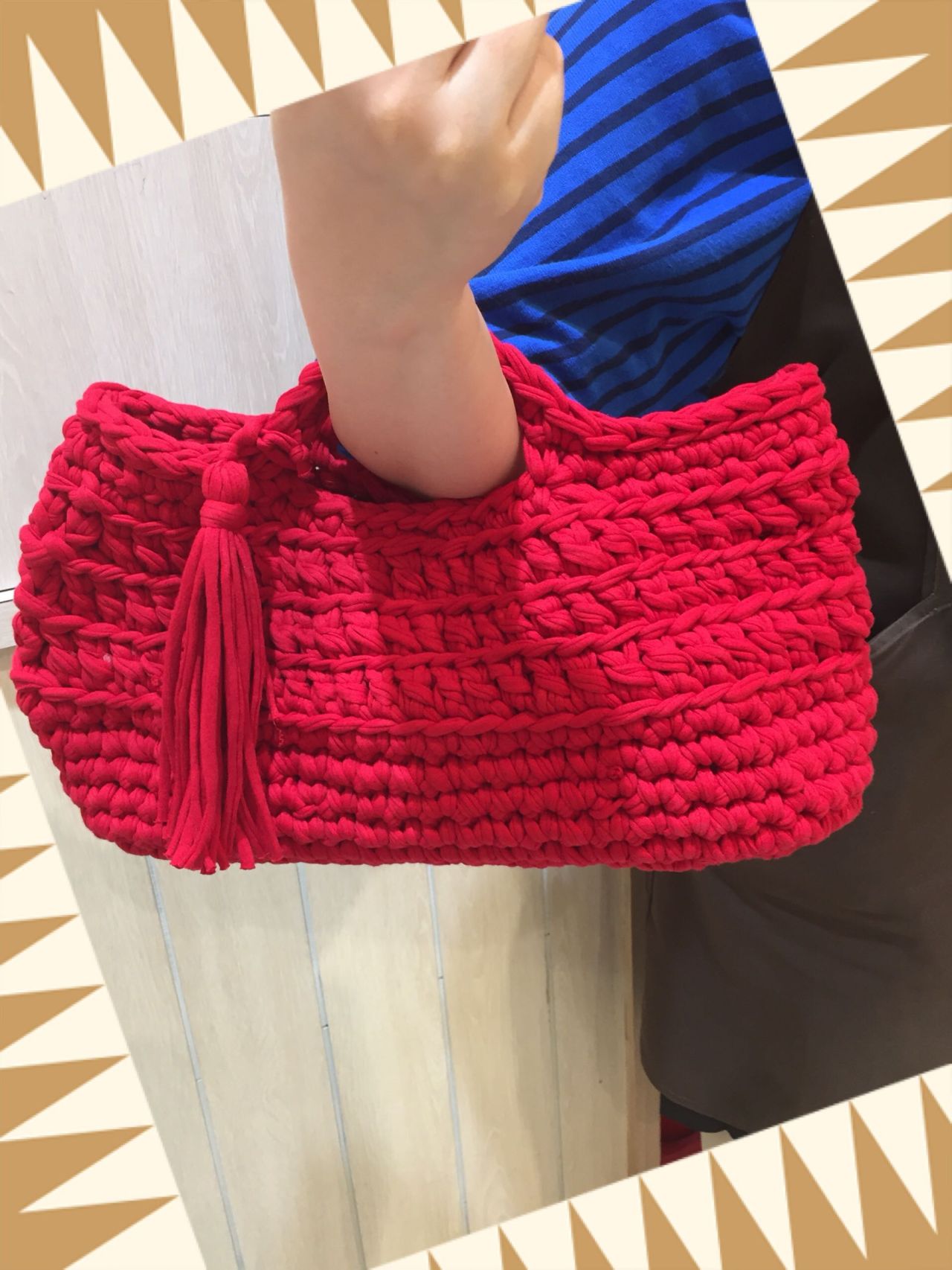 ズパゲッティ 1.5玉を使って無事完成したバッグはお店に飾ってあります。