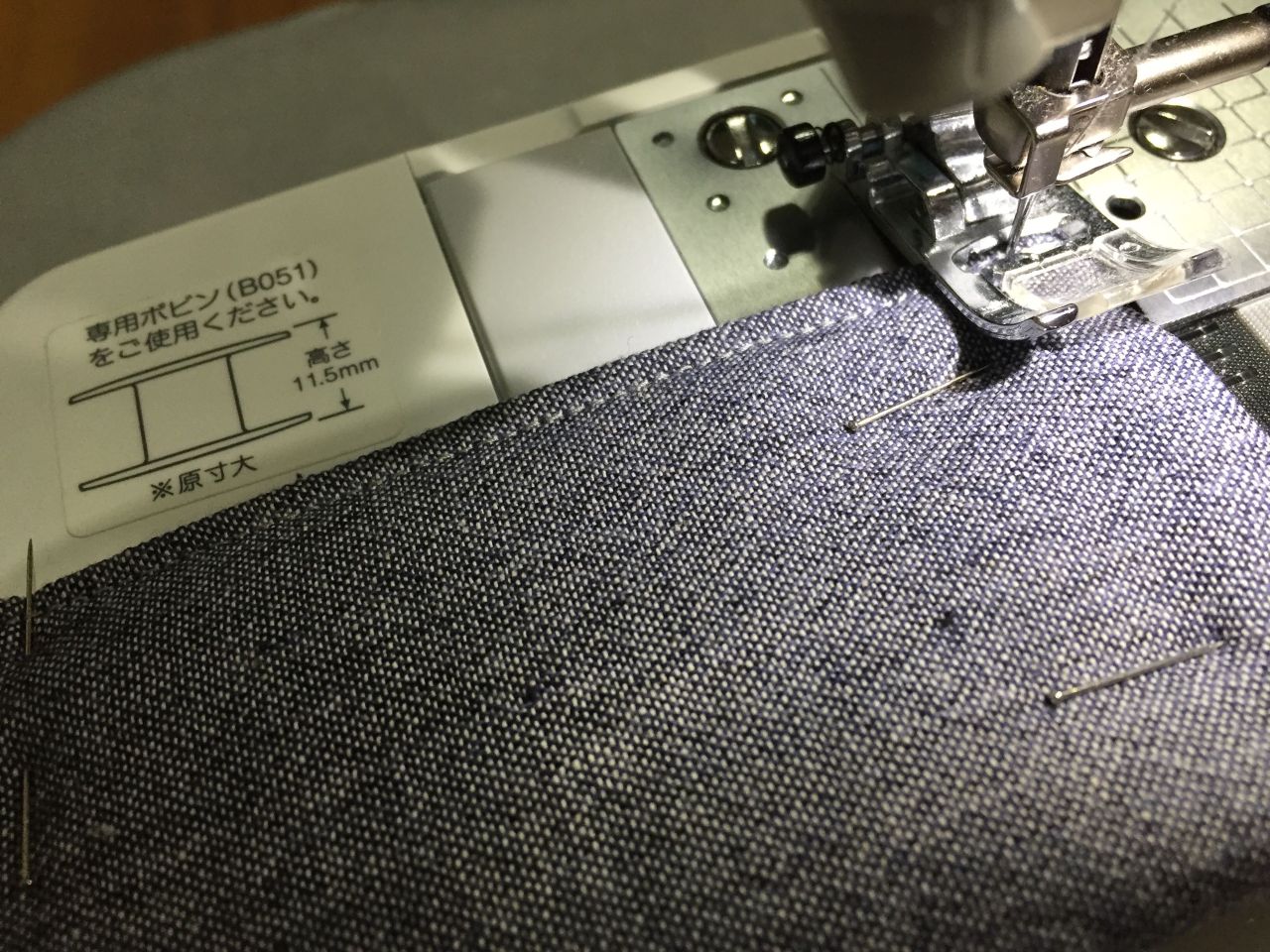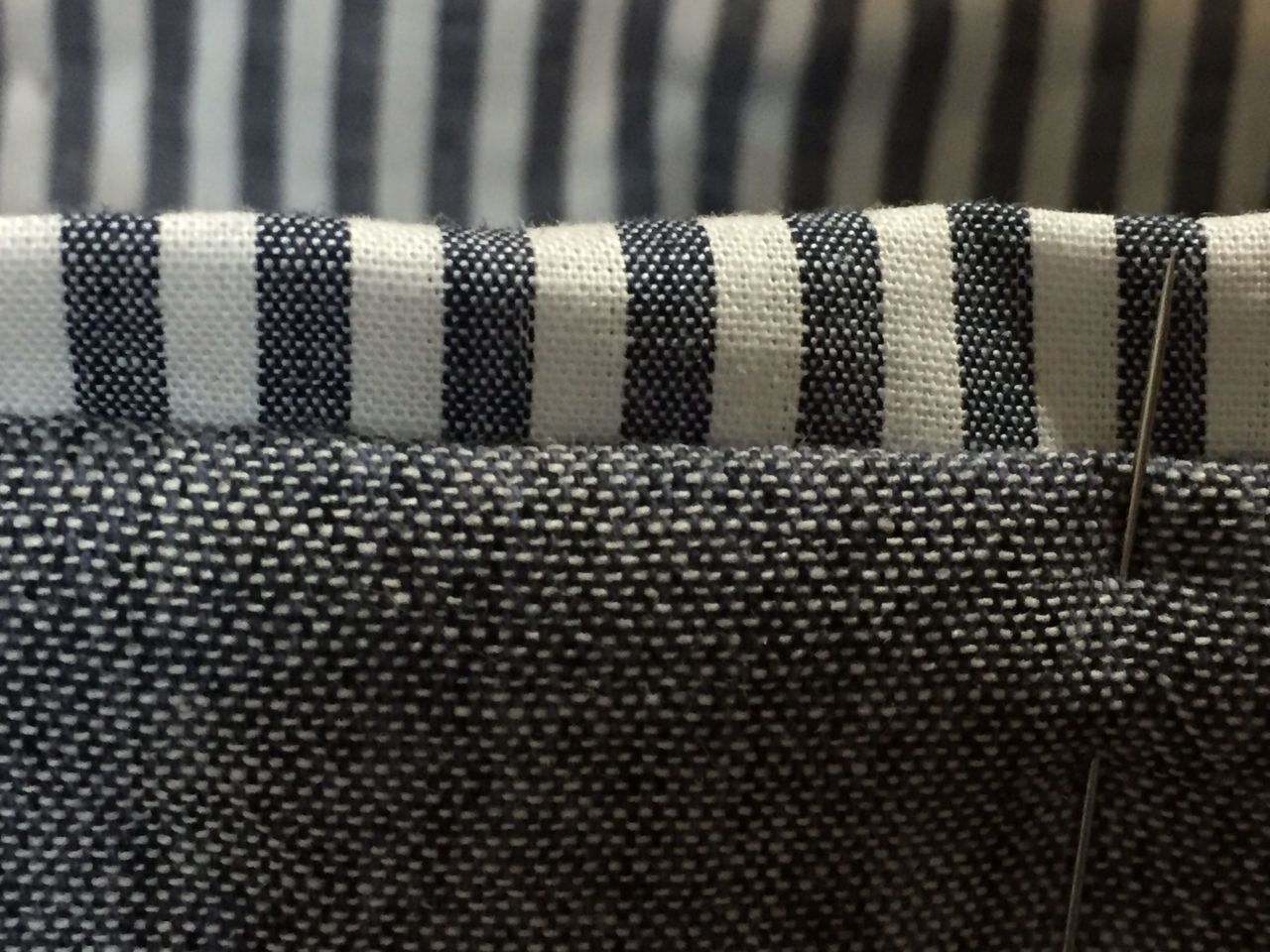 裏地をつまんで下の布が乗り上げるようにマチ針でしっかり止めて縫います!