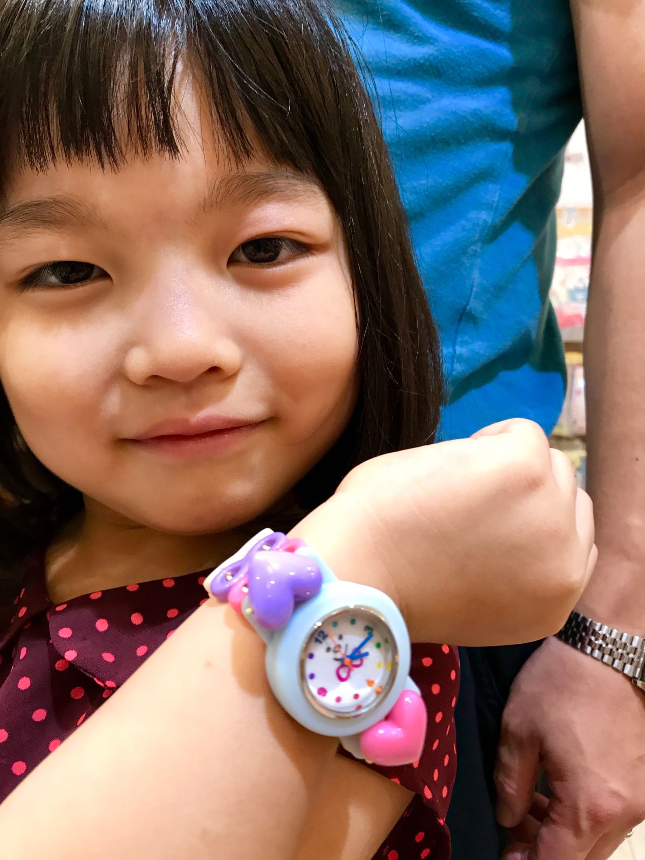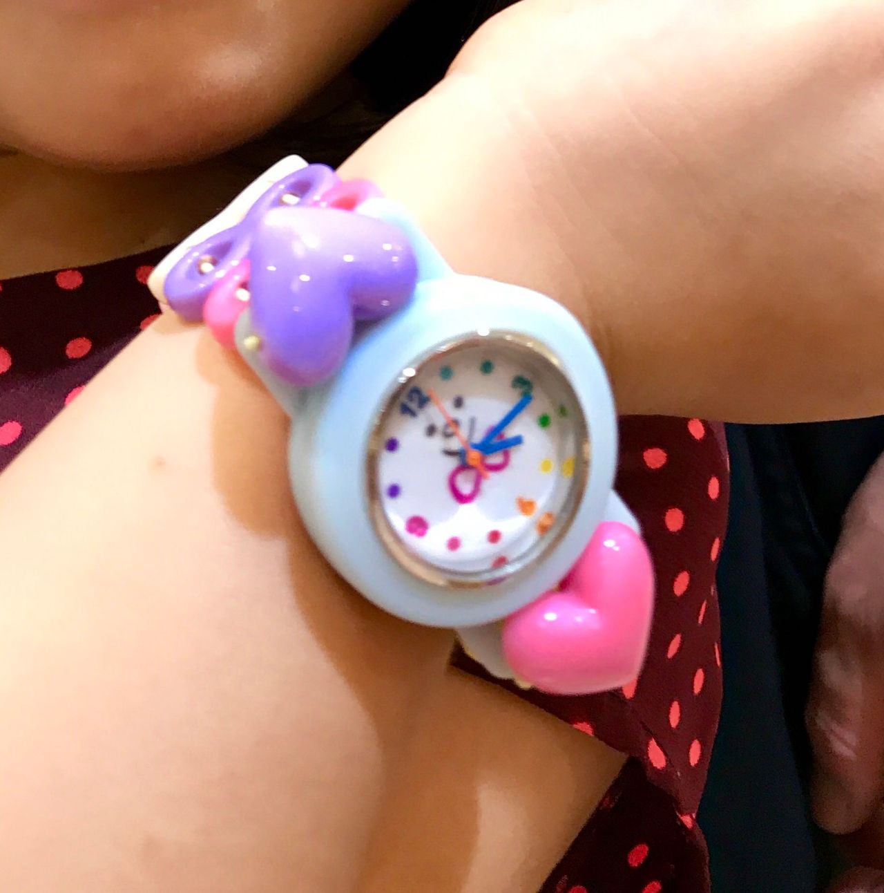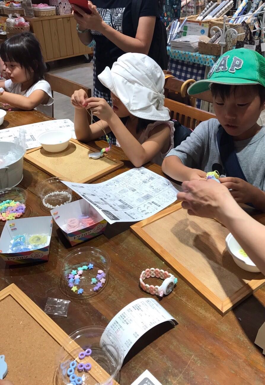 好きな色の時計とビーズを、ゴムに通して作ります。