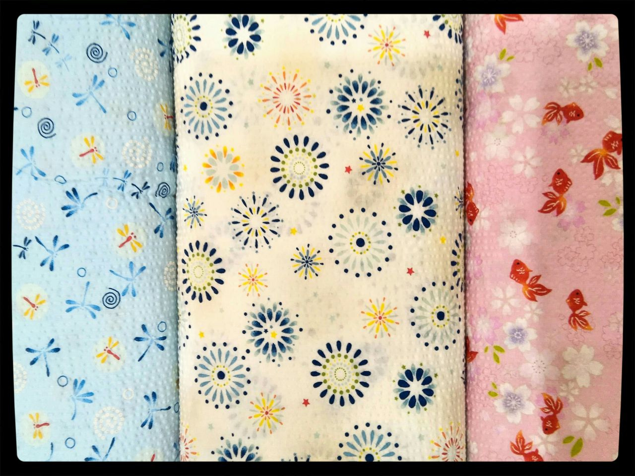 『リップル生地(右から金魚·花火·トンボ) 108cm幅 m /¥900+税』