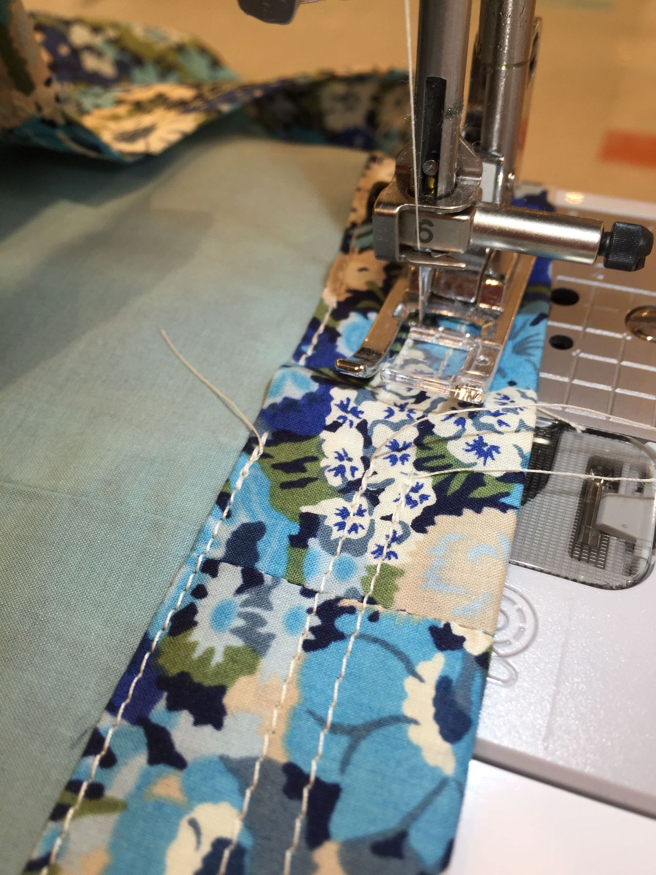 ③無地のローン生地が3.5センチ表から見えるように内側に折り込んで、表から縫います。
