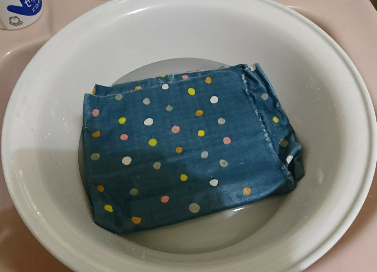 まずは、桶や洗面台などにお水を溜め、購入したその状態のままお水に投入!すっかりお水に浸かったら、そのまま一時間ほど放置します。洗剤を使ったり、フリフリ揺らしたりする必要はありません。畳んだままでOK!