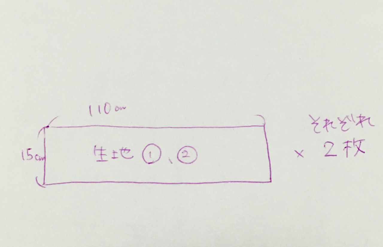 ①タテ15cm×ヨコ110cmの長方形パーツをそれぞれの生地で2枚づつ用意する。