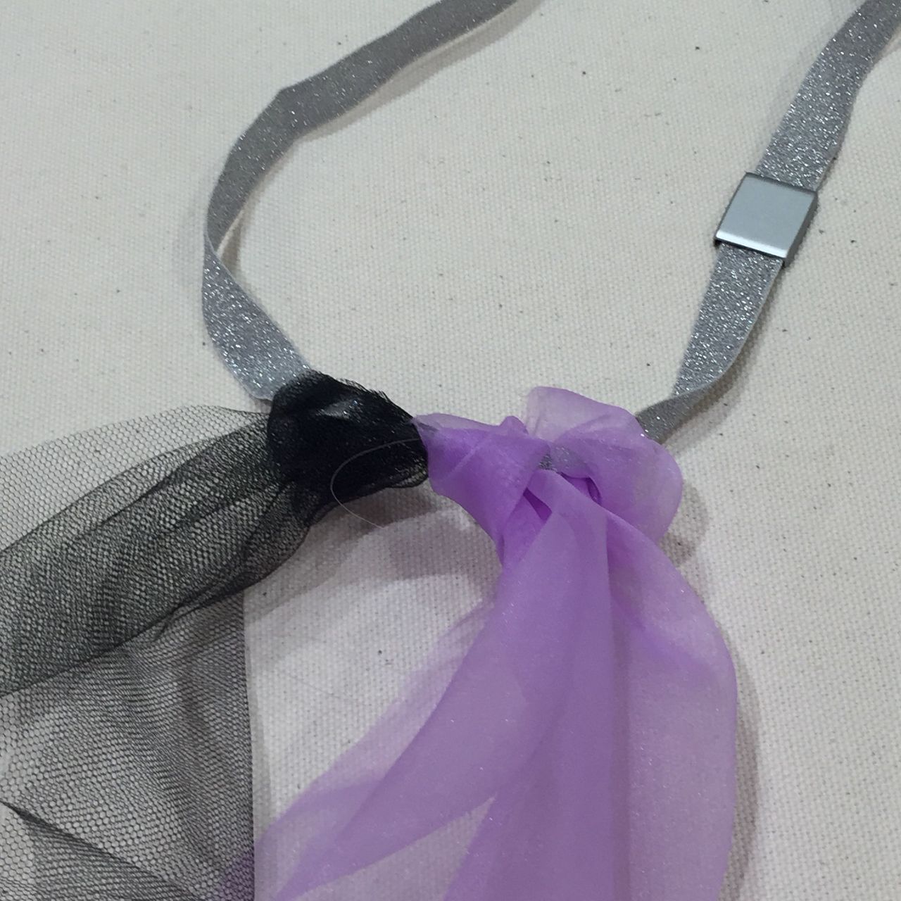 ③  ①.②で切った短冊状のチュールとオーガンジーを互い違いにゴムに結んでいく。