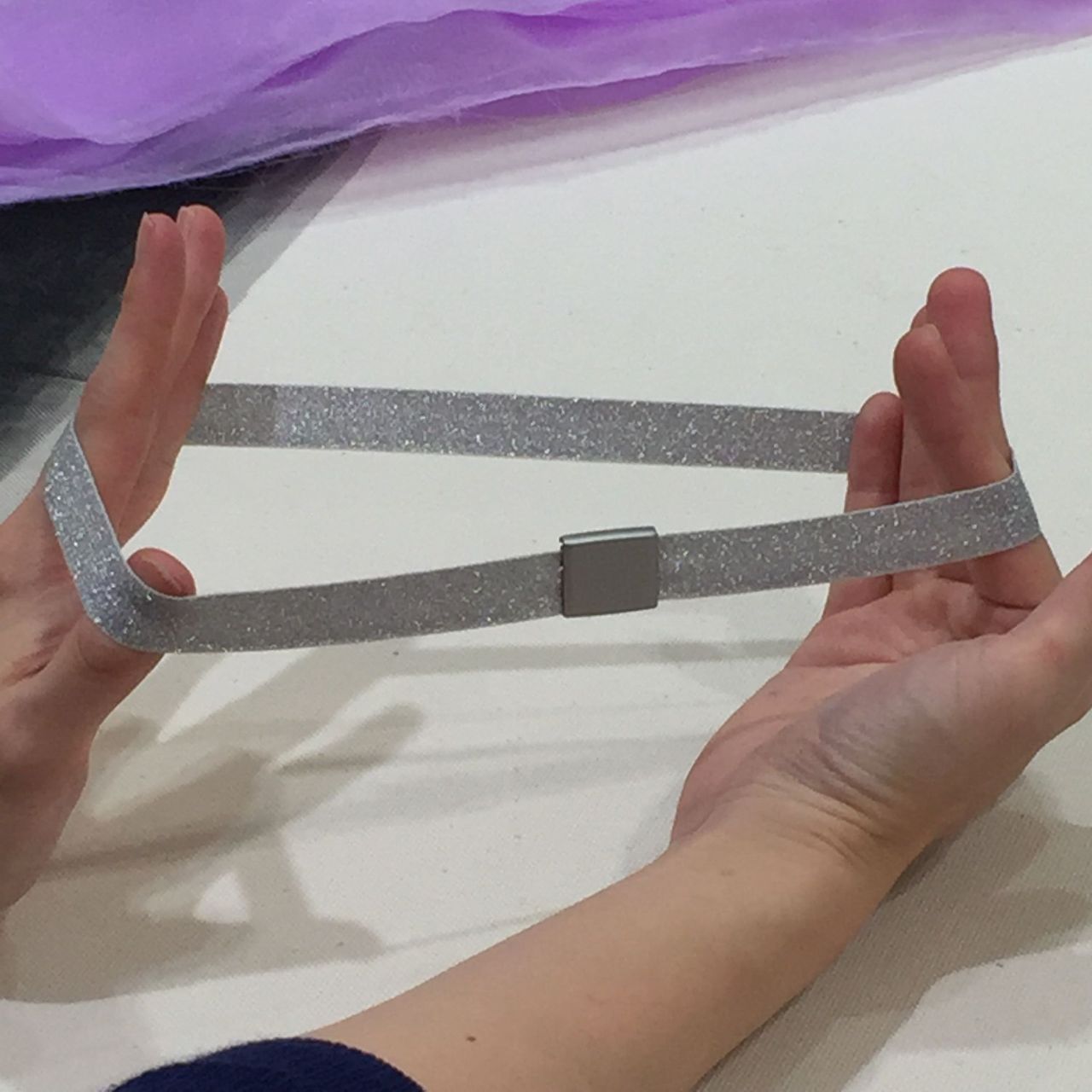 ②ゴムをウエストに合わせてカットして輪っかにし、ゴムパッチンで留める。