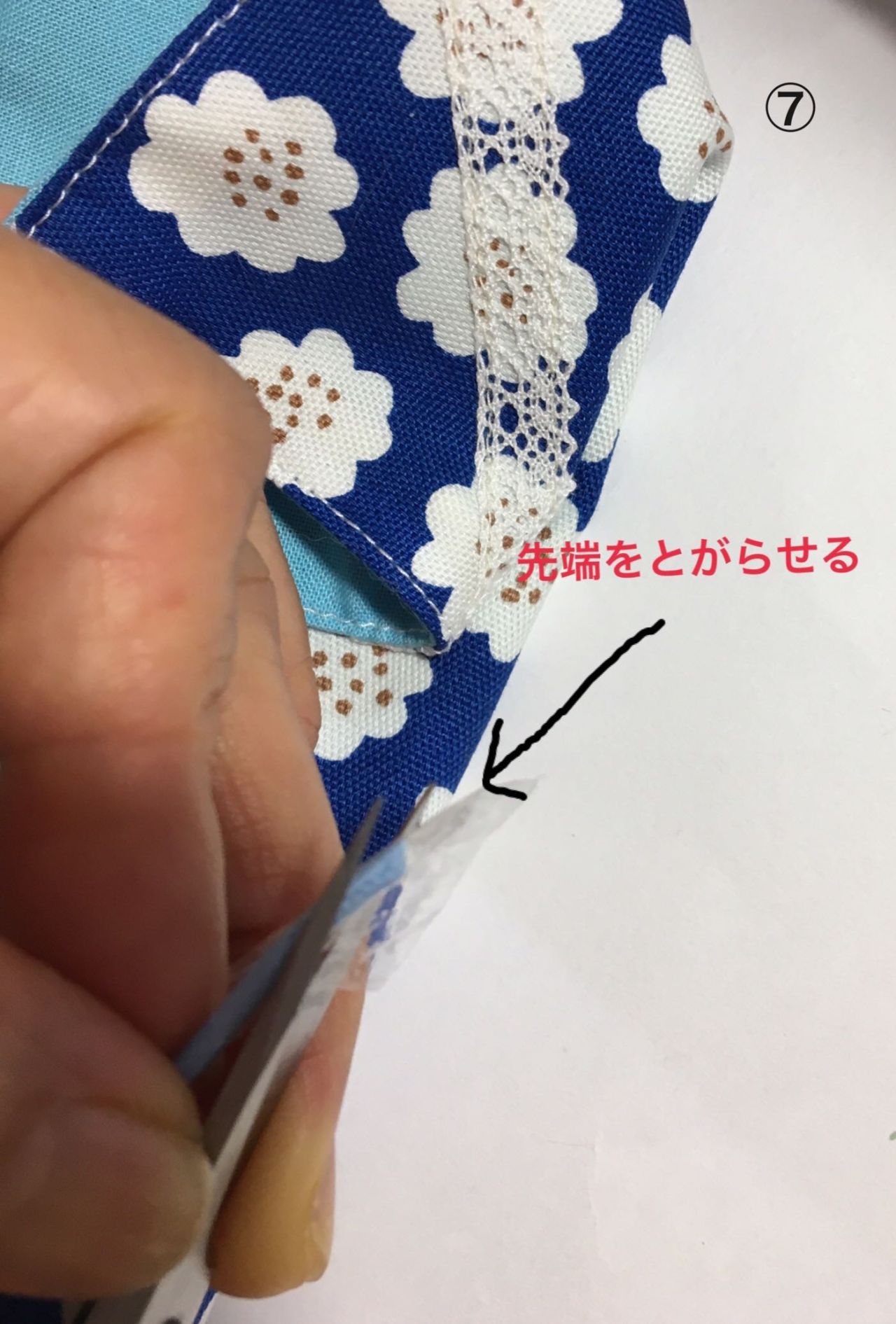 ⑥角が出たら縁から2.3ミリのところをぐるりと縫います。