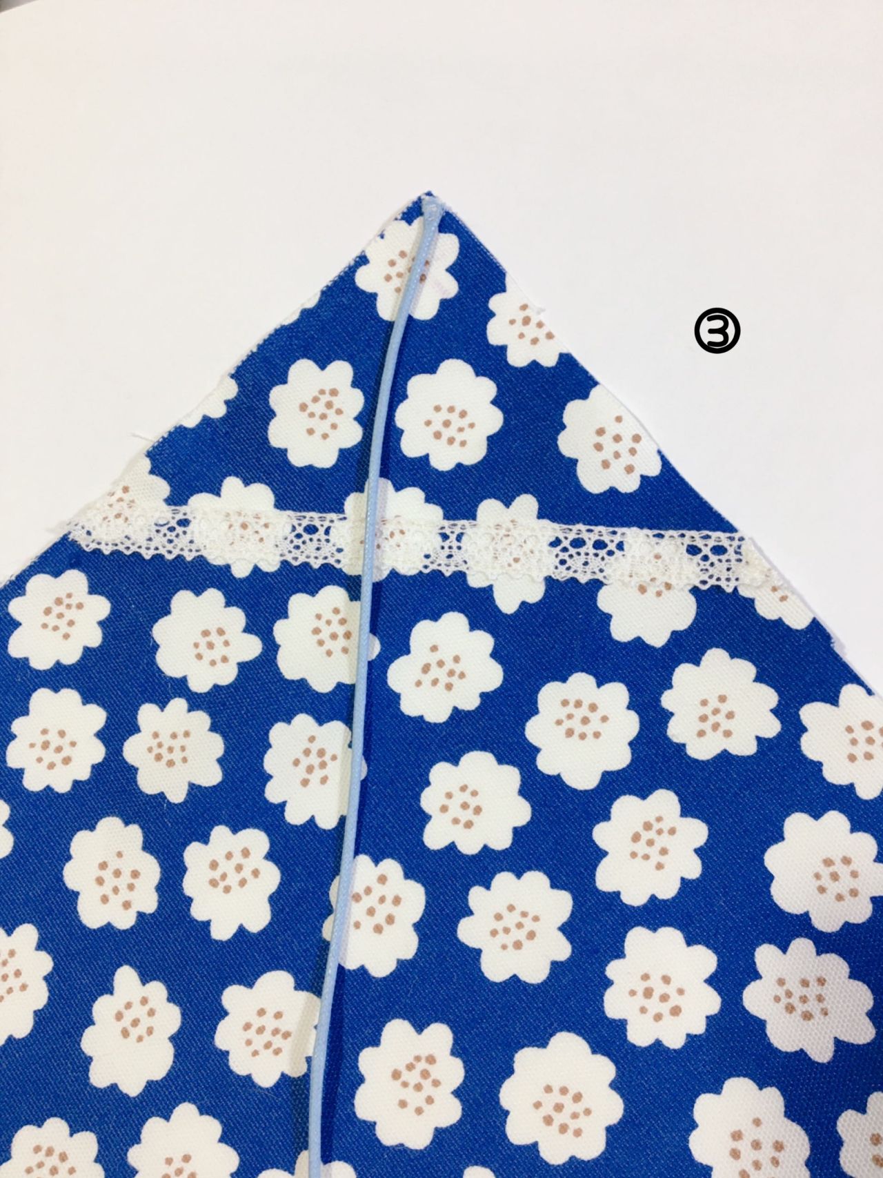 ③表生地の三角山の部分(表側)にコードとレースを縫い付けます。