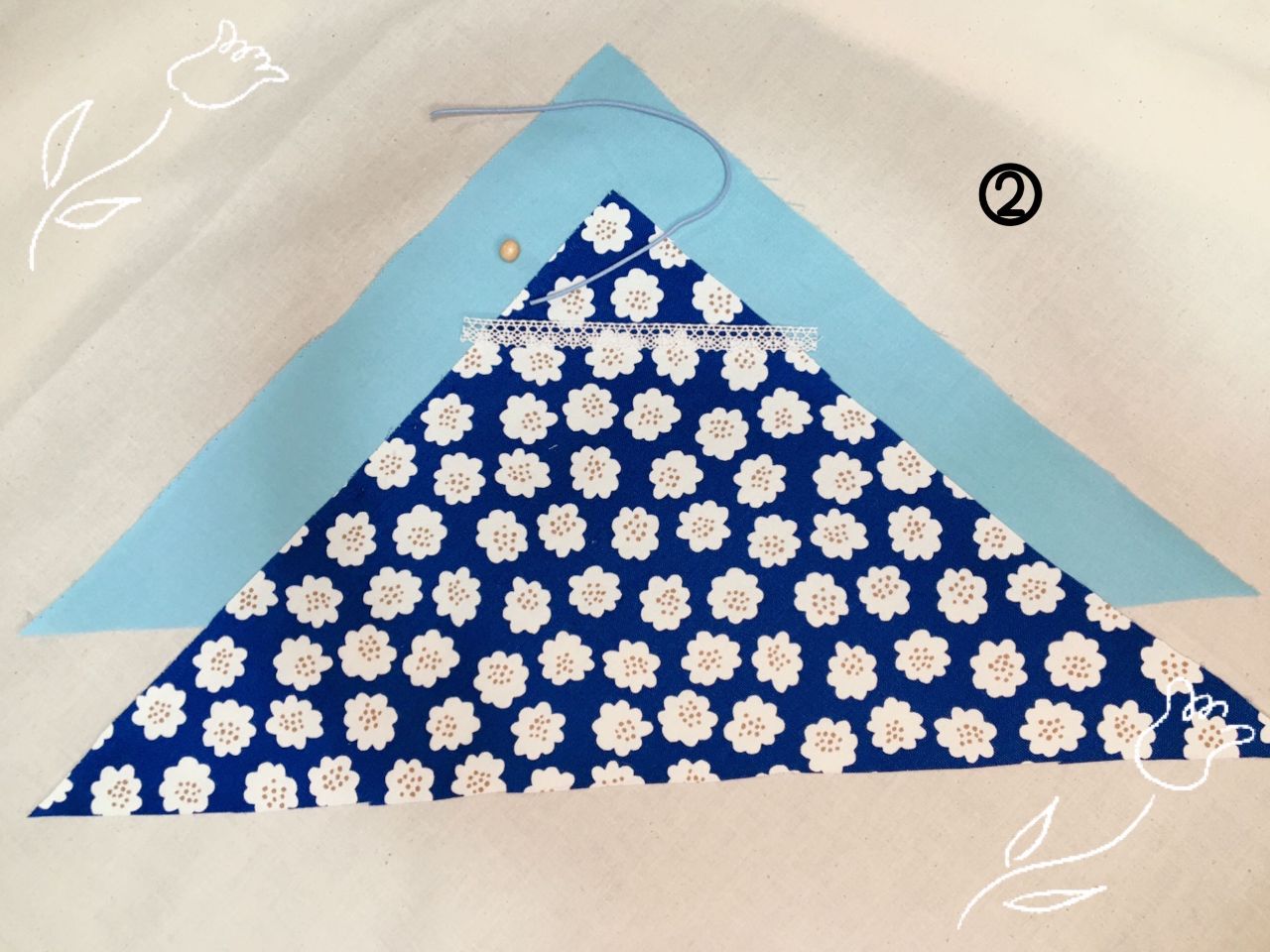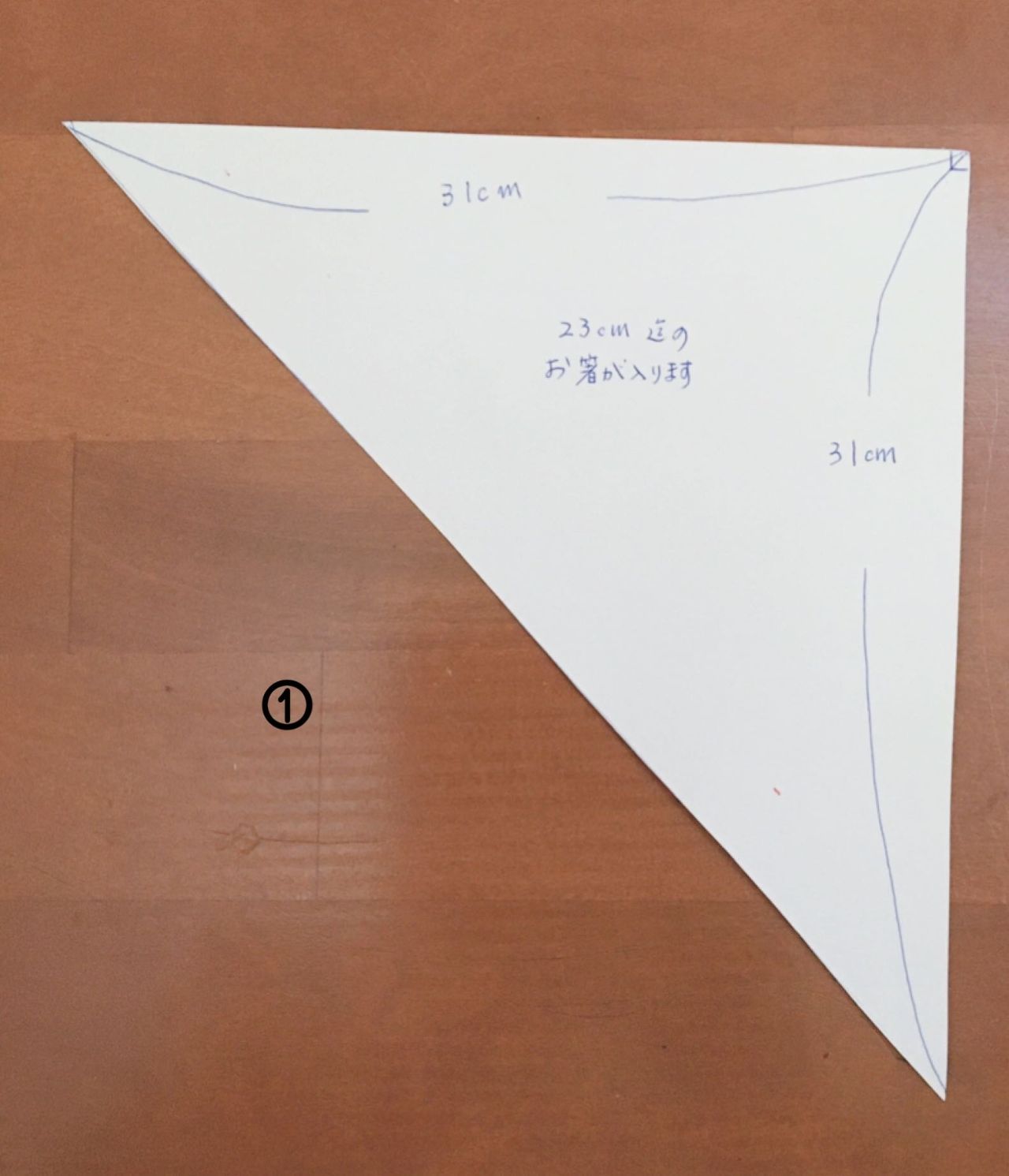 ①表生地、裏生地共に31cmの二等辺三角形の形にカットします。