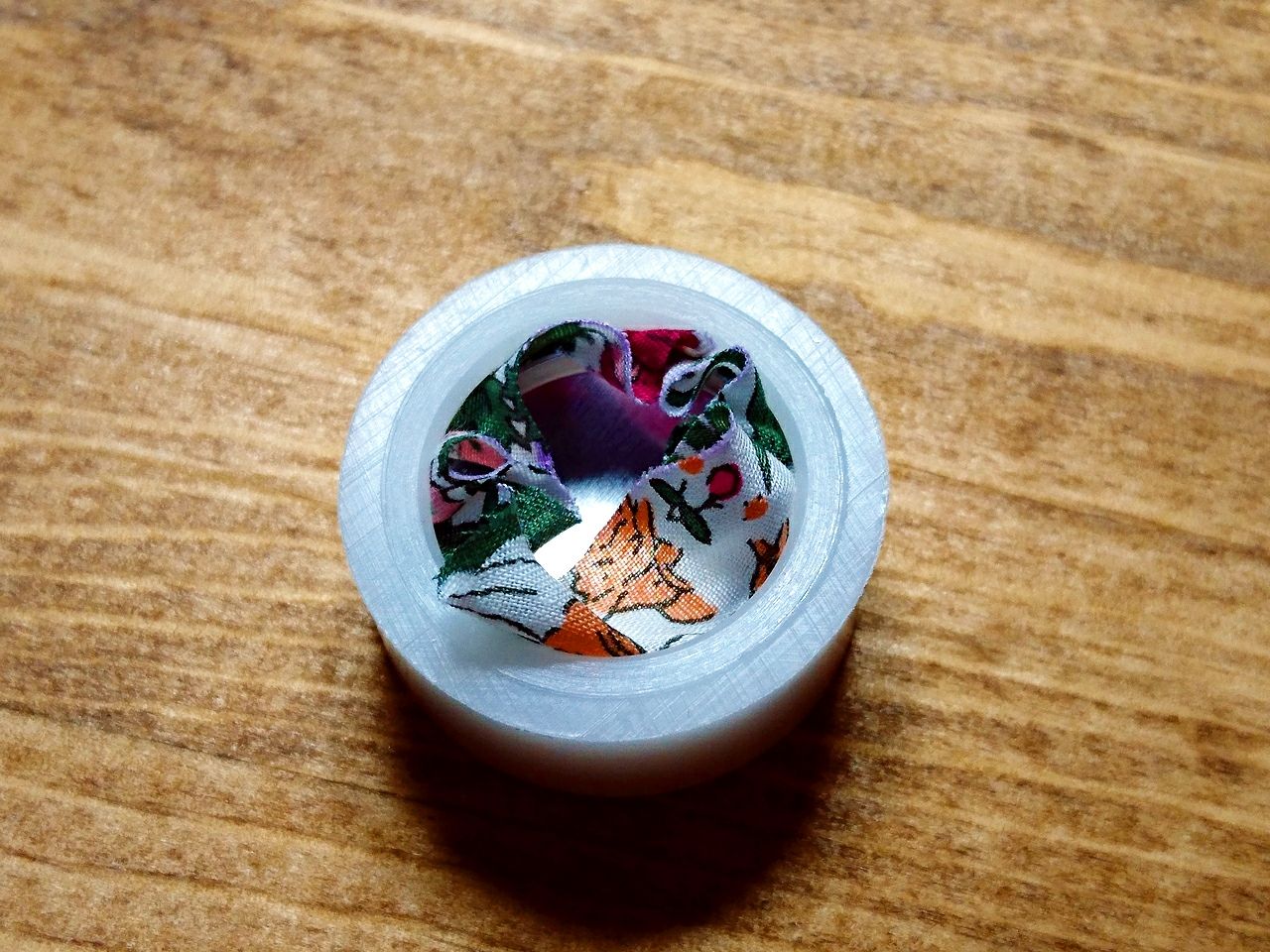 台座にカットした生地の表が下になるように置き、ボタンを中央にのせて押し込む。