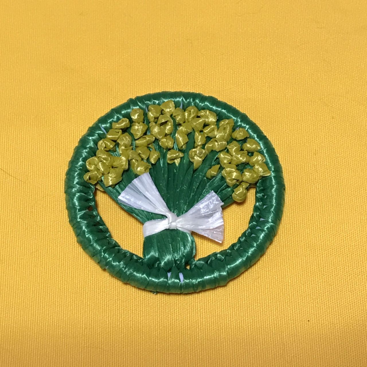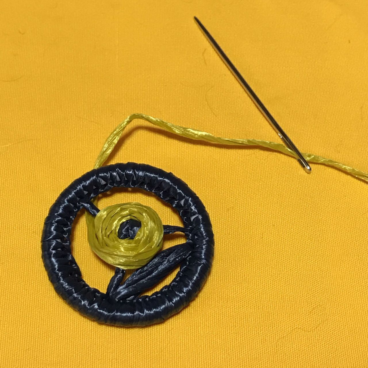 渡したネイビーの糸にライムイエローの糸を時計回りに絡ませていくと‥完成!