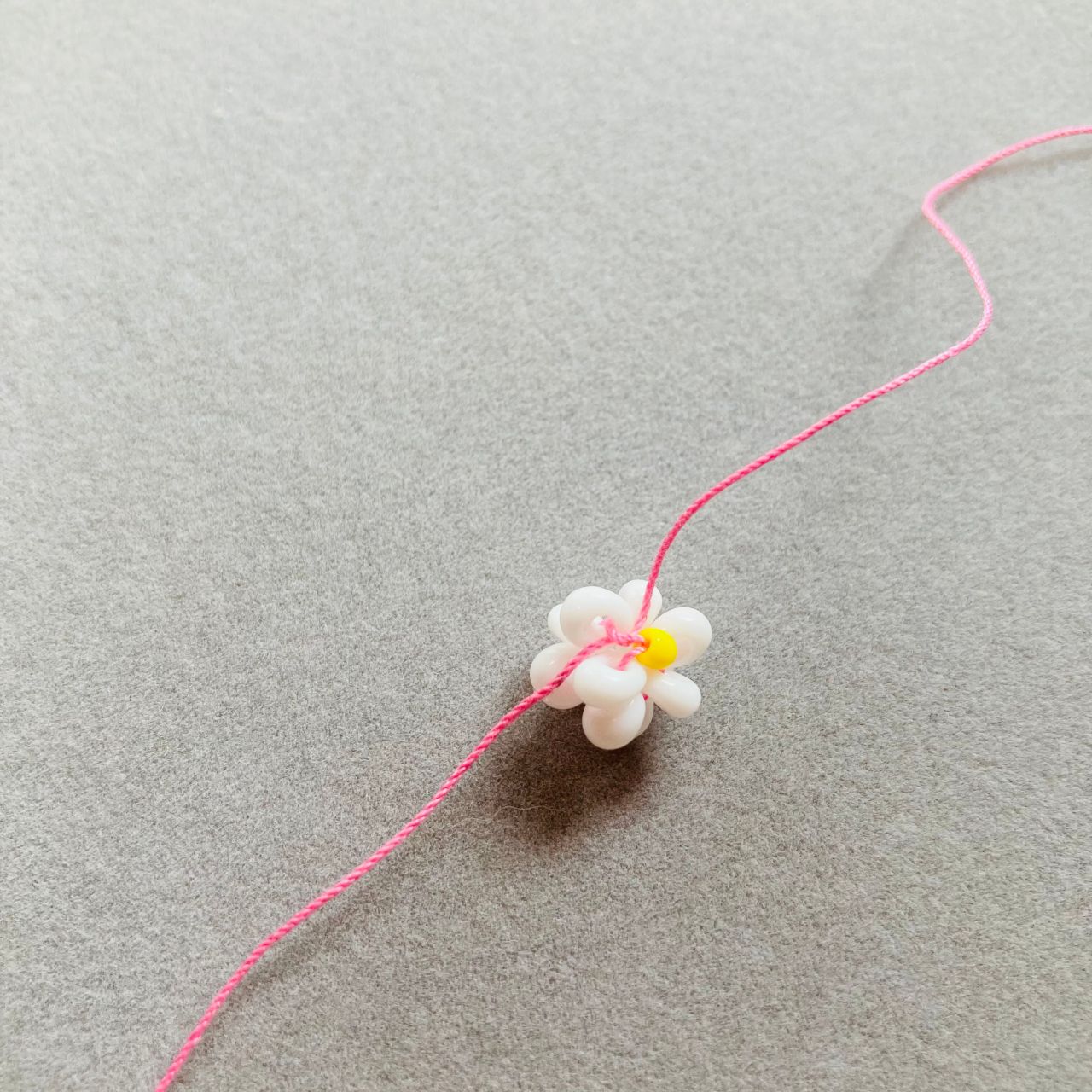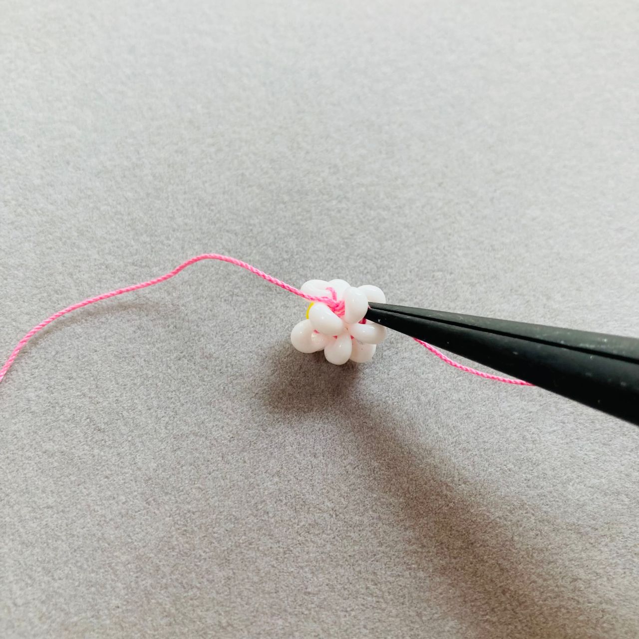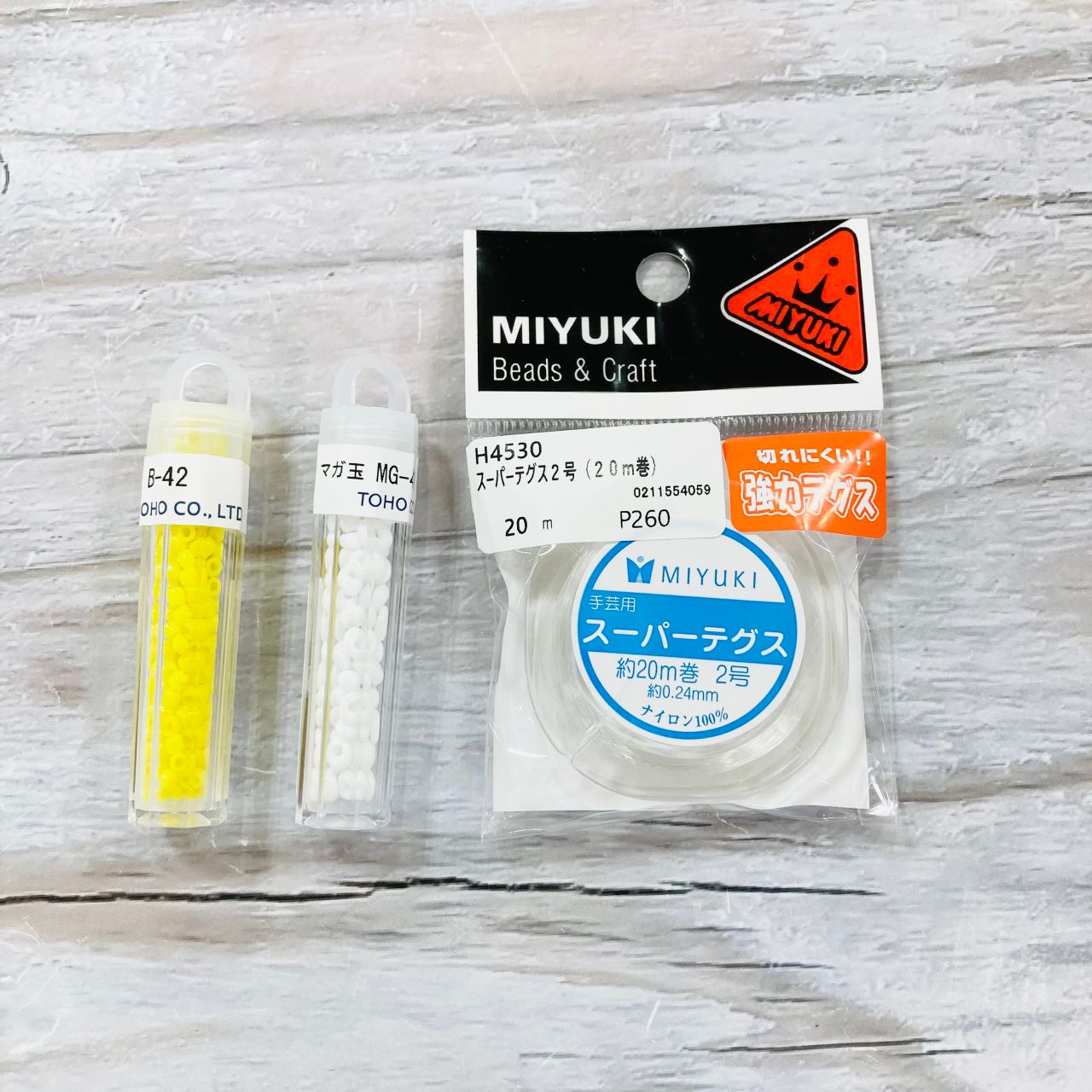 2. テグスにホワイト→イエロー→ホワイトの順で通しテグスの中央におきます。