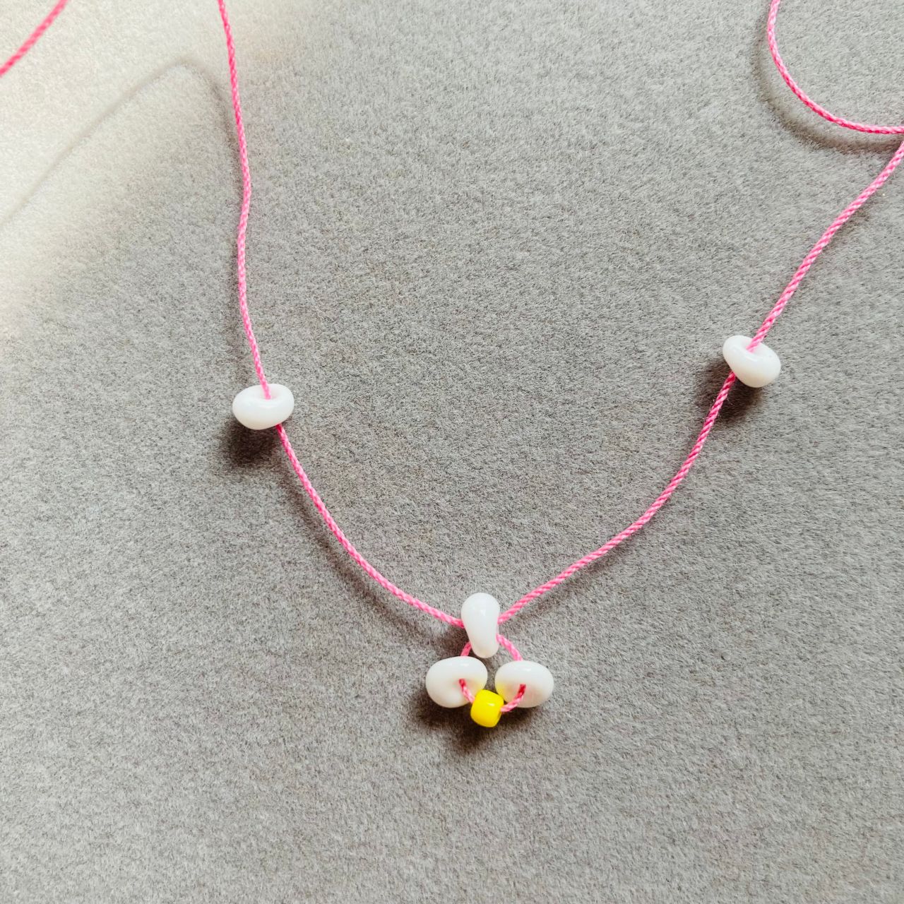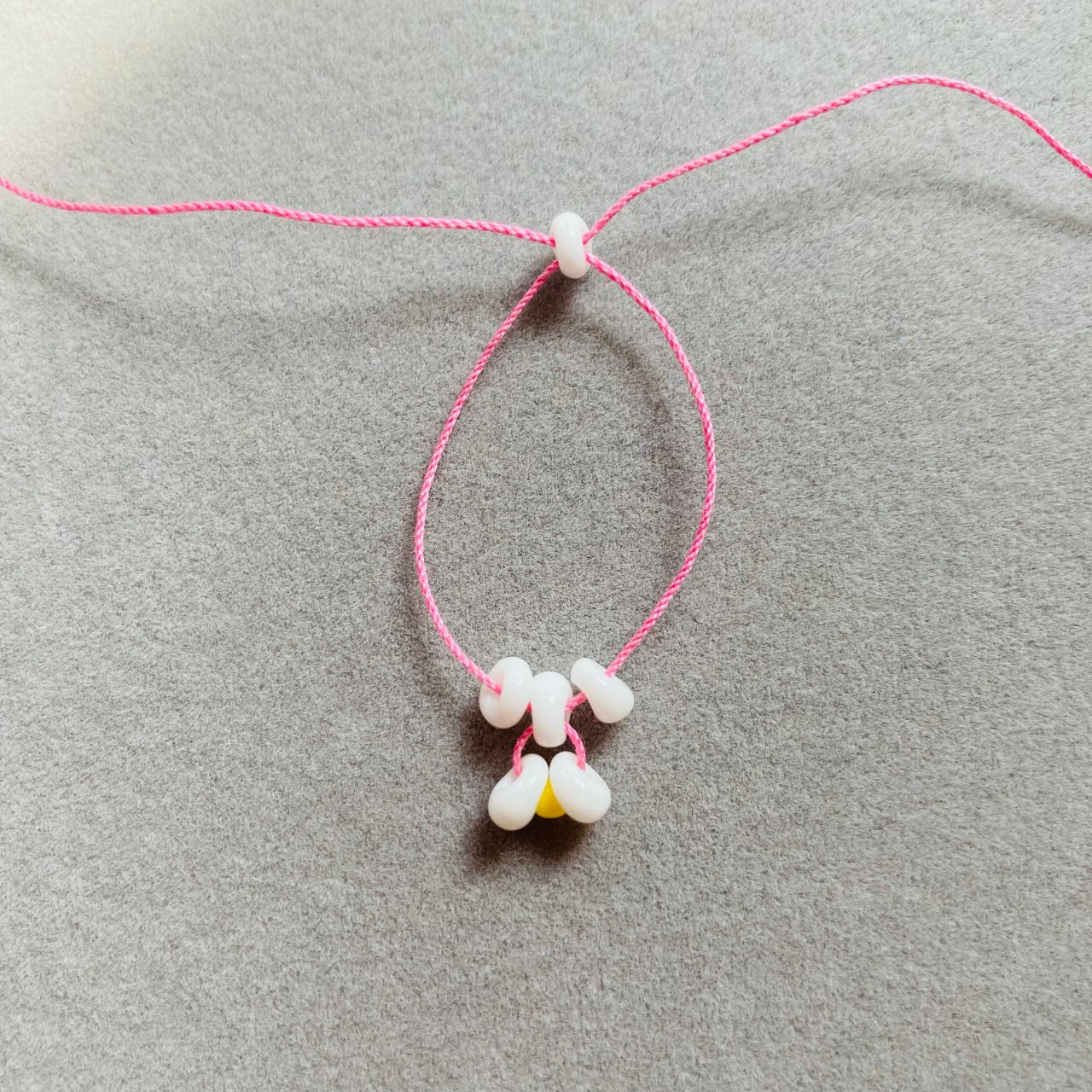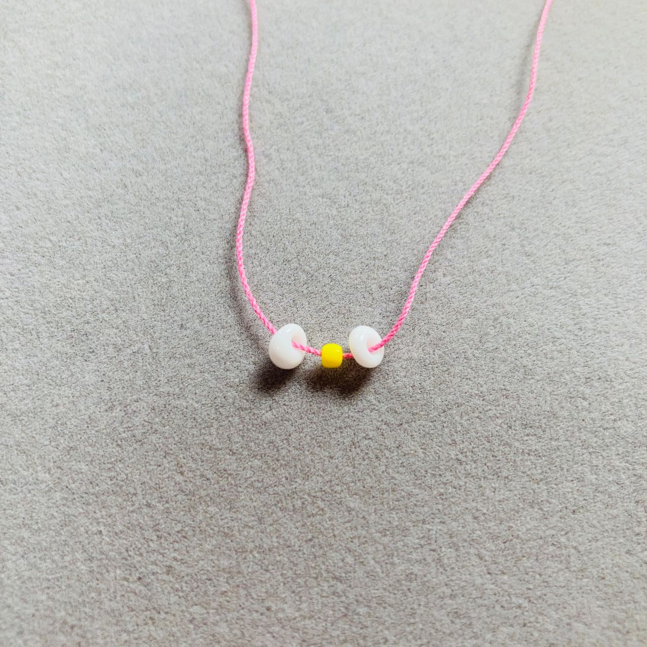 2. テグスにホワイト→イエロー→ホワイトの順で通しテグスの中央におきます。