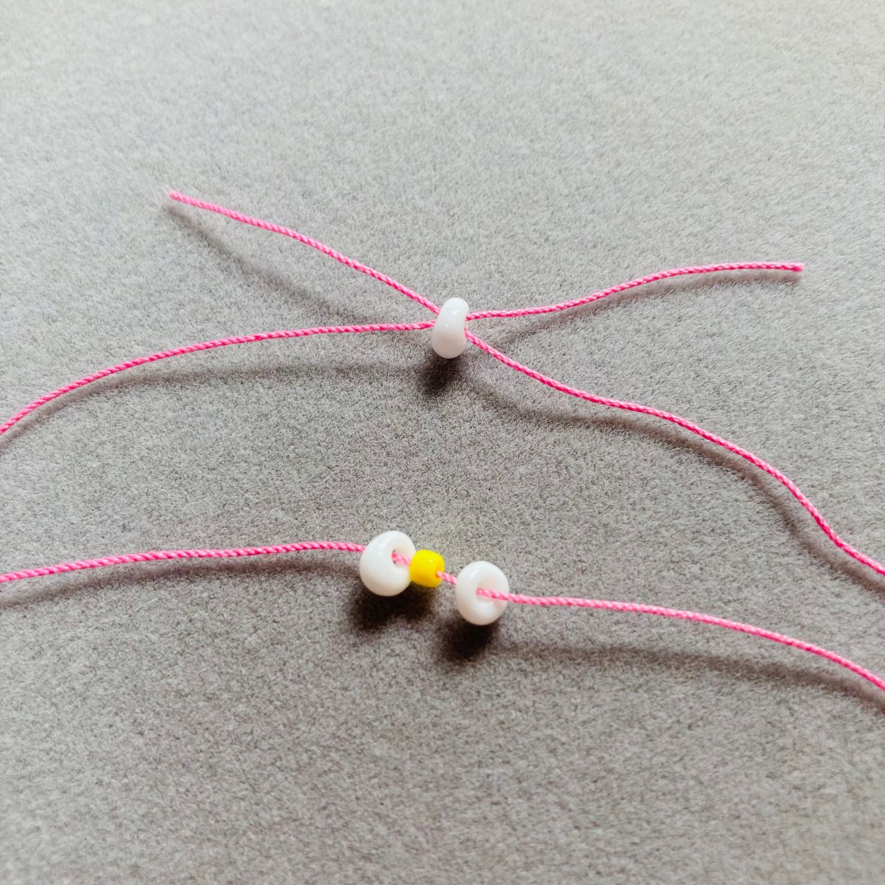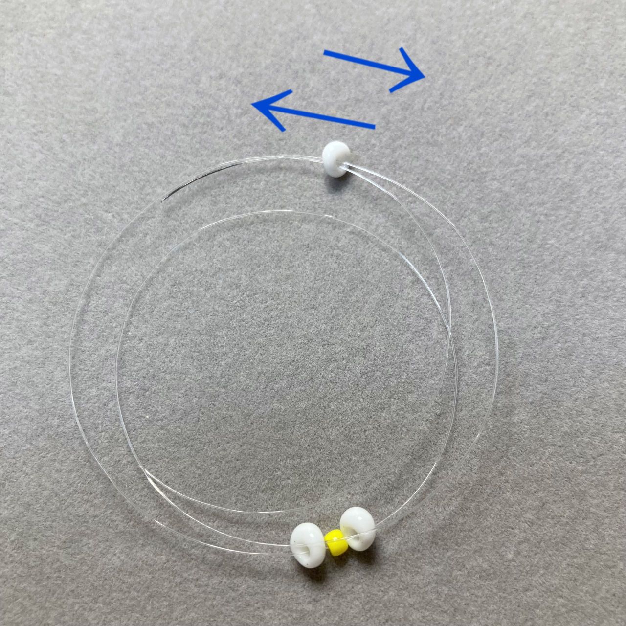 3. 両方のテグスにホワイトを1個ずつ通します。