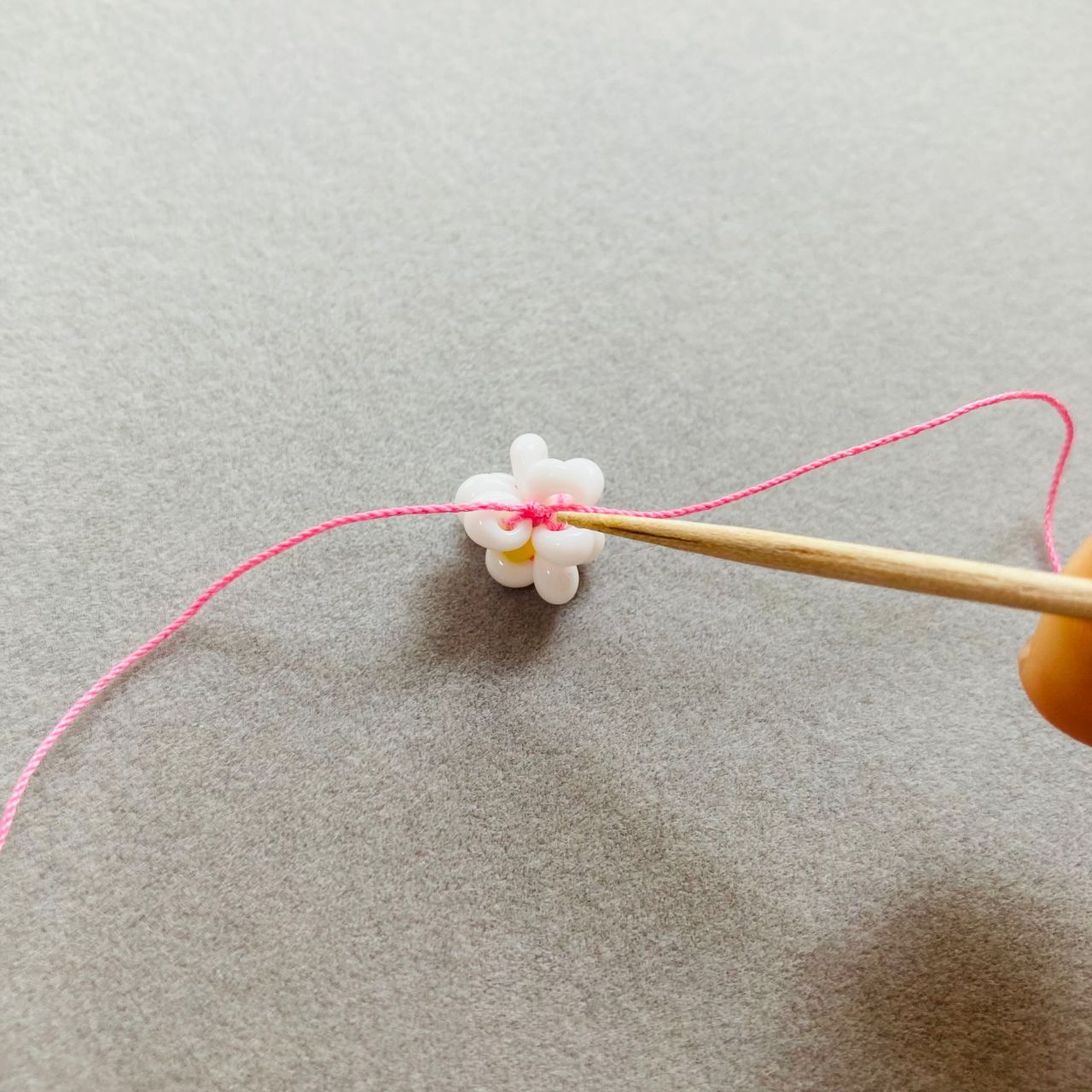 9. 結び目にボンドを付けて、片方のテグスを隣のホワイトに通して強めに引き、結び目を隠す。