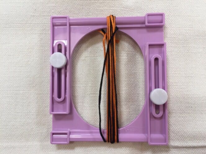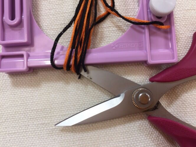 ①タッセルメーカーsmallを10cmに合わせ、刺しゅう糸を10回巻く。