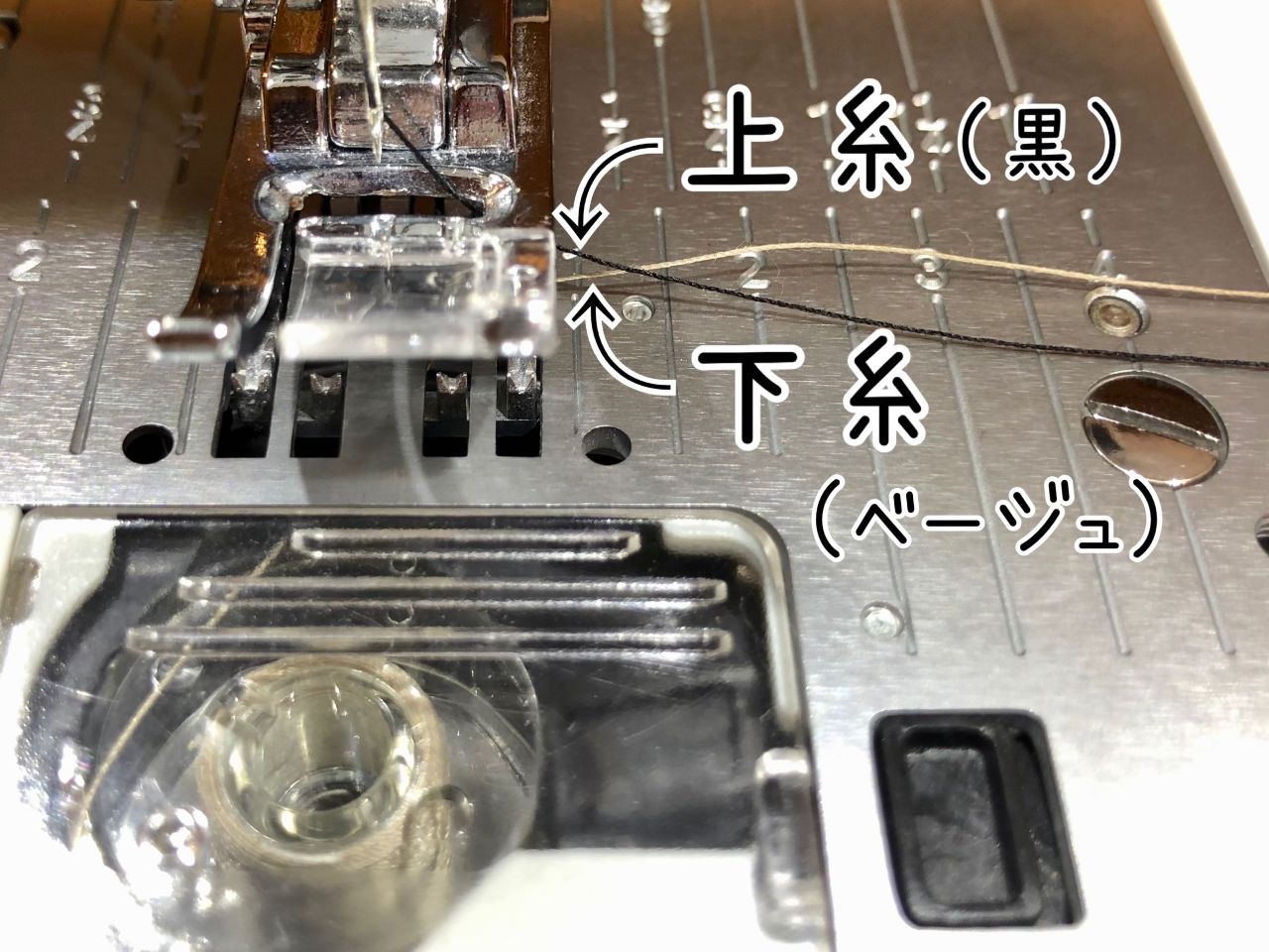 上側が黒、下側がベージュで重ねて縫い合わせる場合には、写真の様に上糸を黒、下糸をベージュにしてステッチをかけます。