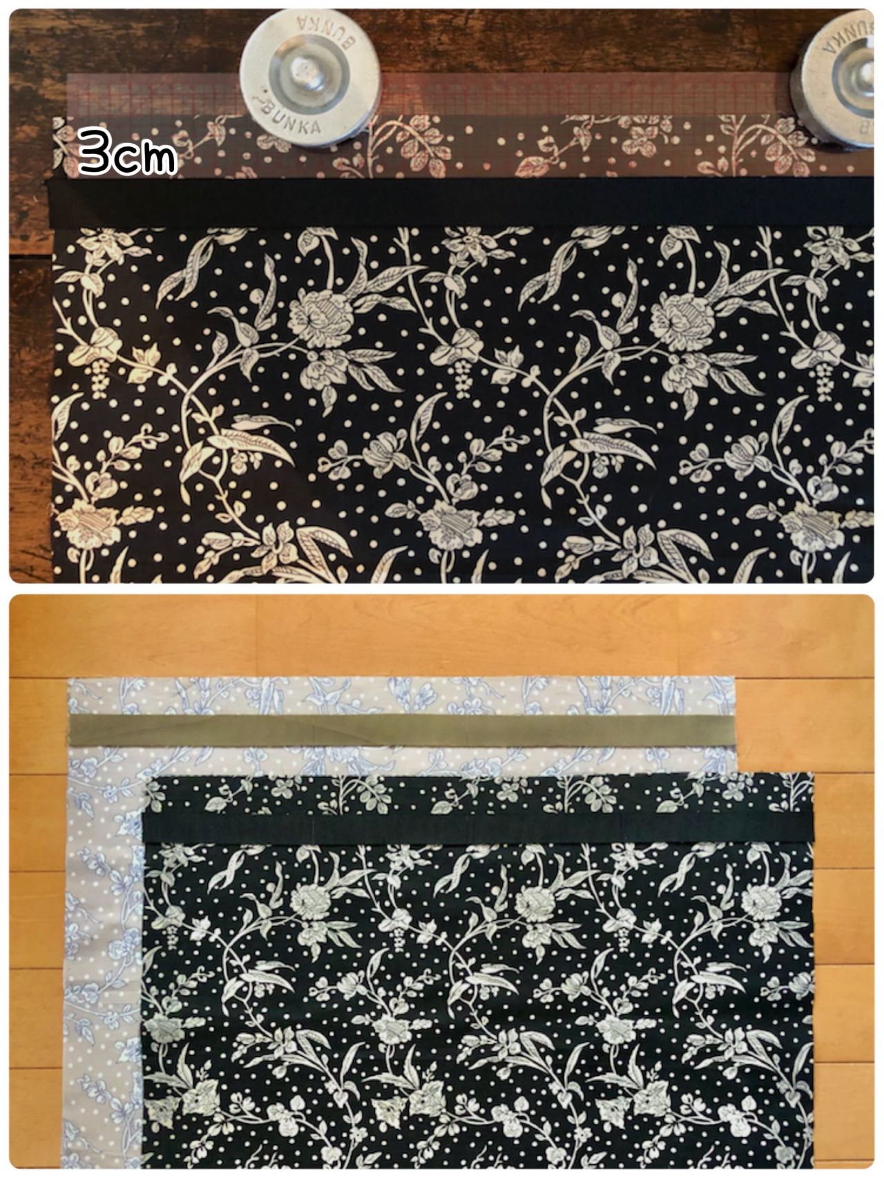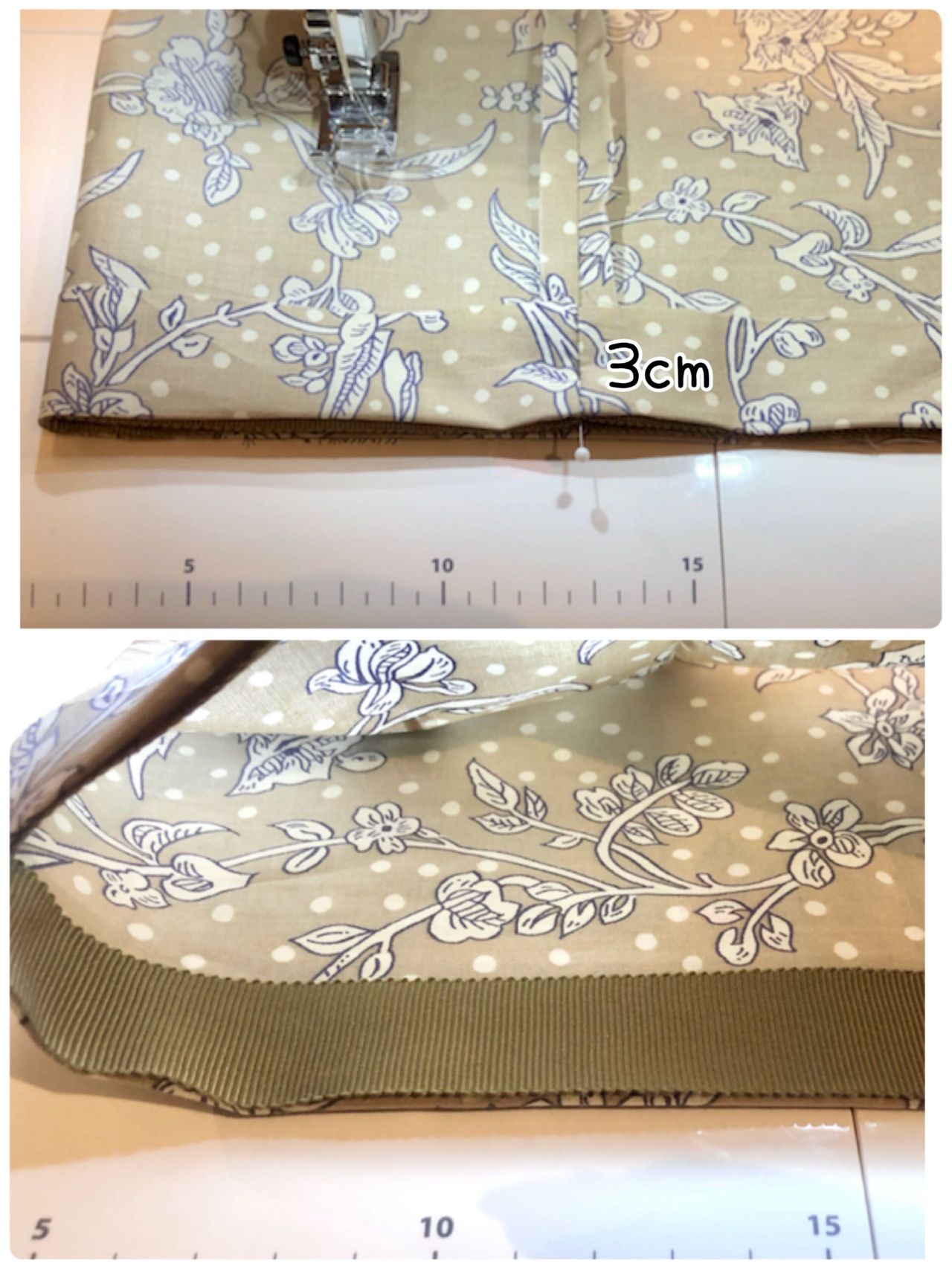 縫い代を3cmで折り、アイロンをかけます。(表布、裏布共同様に)