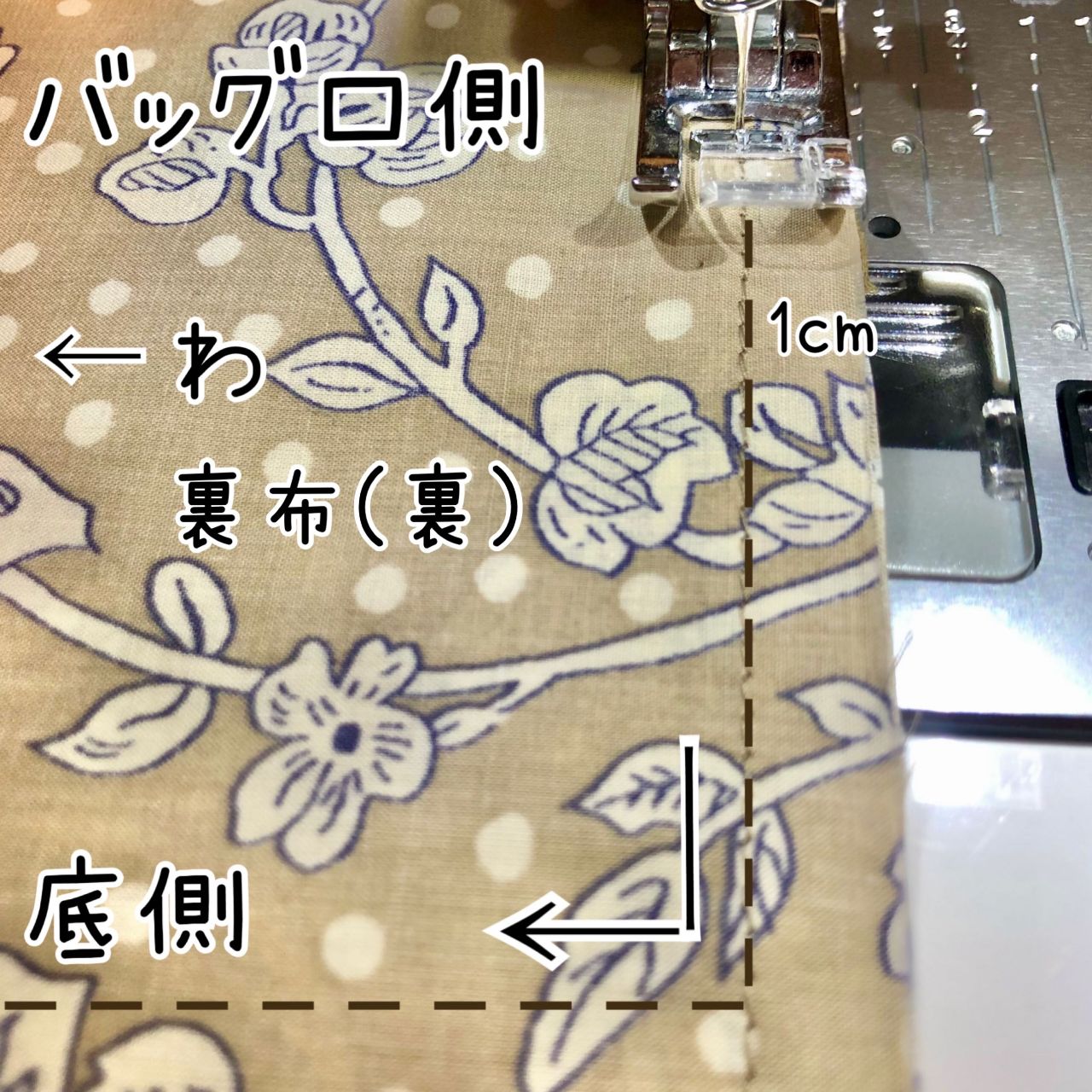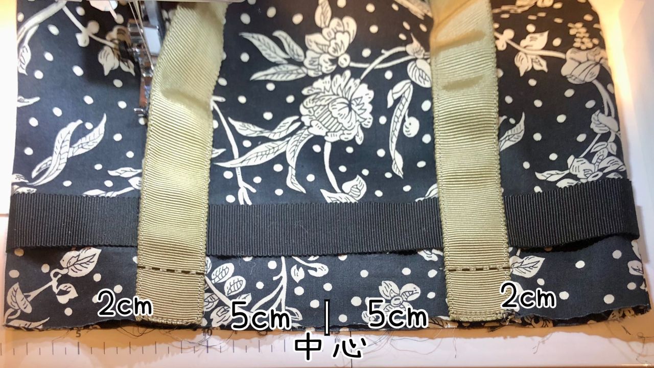 バッグ表布のバッグ口幅の中心からそれぞれ5cmのところに持ち手を中表に乗せます。バッグ口の端から縫い代2cmで持ち手を縫い付けます。