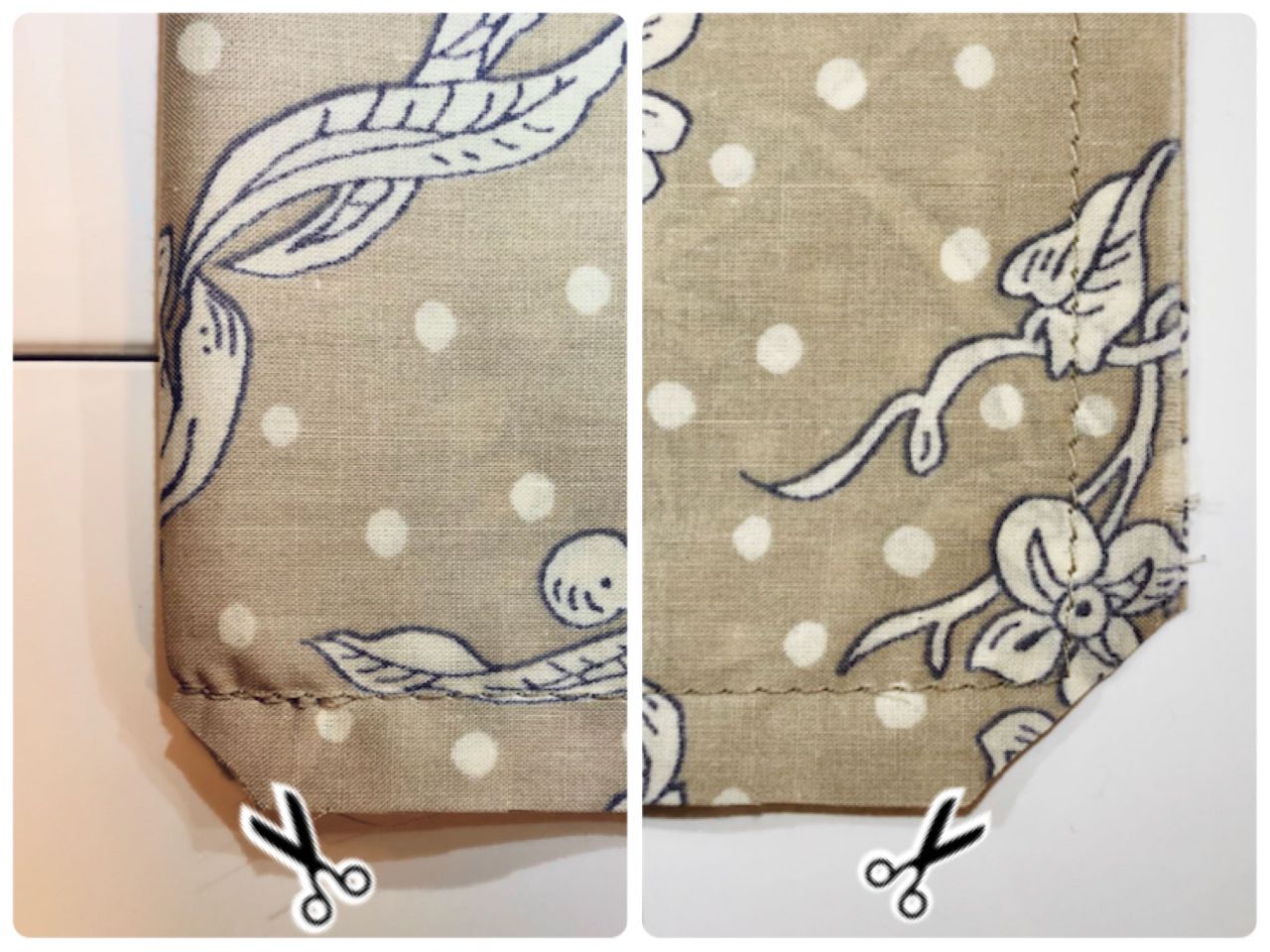 ※袋布の表布に裏布を入れ込んだ時、縫い代が重ならない様にする為、表布と裏布の底縫い代は同じ方に倒します。