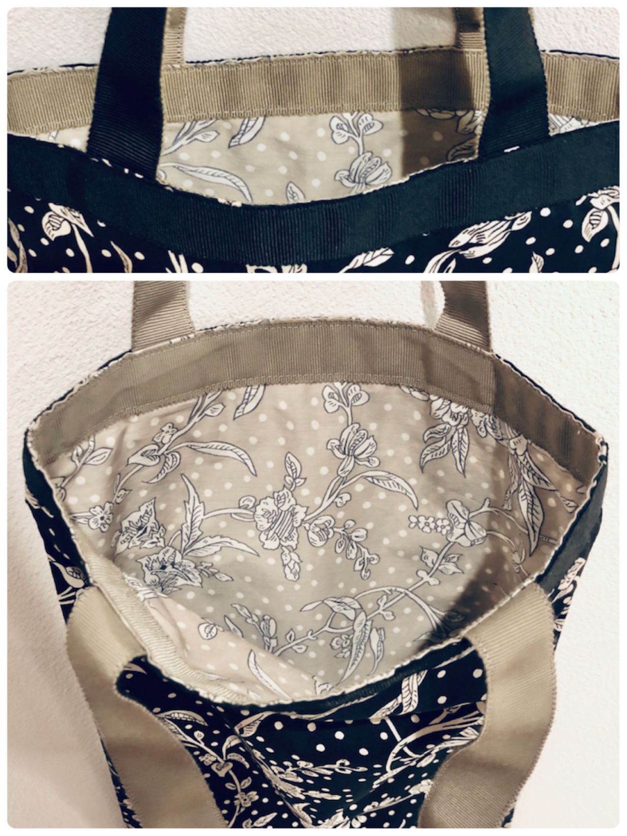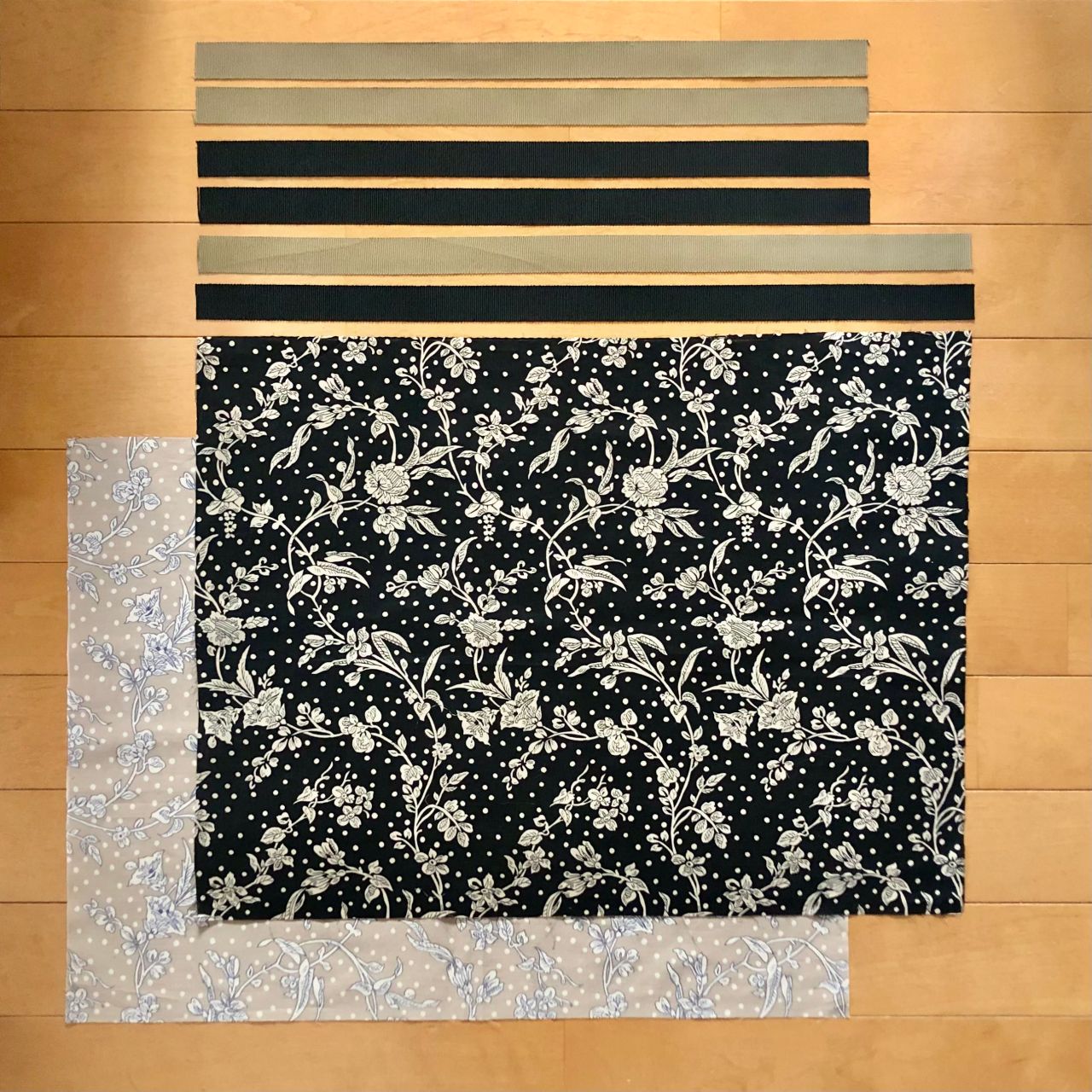 持ち手用リボン表(黒)と裏(ベージュ)、袋布のバッグ口にリボンを(表布、裏布共同様に)それぞれ仮止めします。