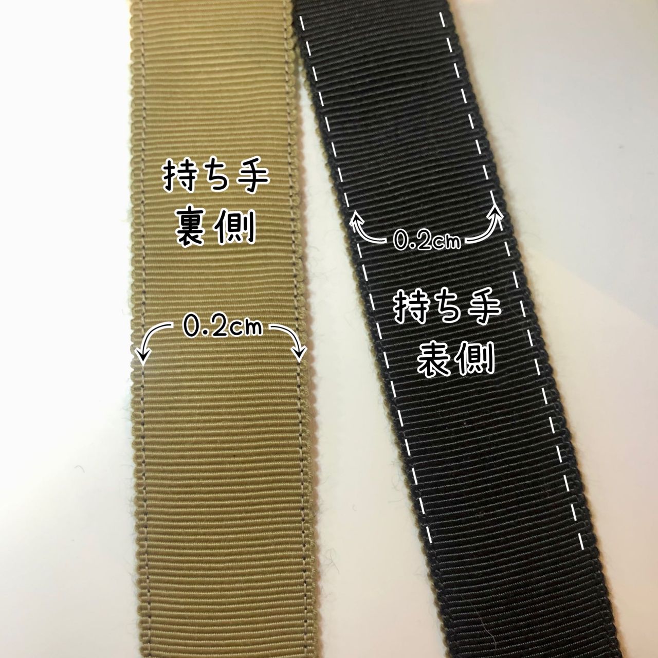 リボンの両端0.2cmにステッチをかけ、持ち手を作ります。