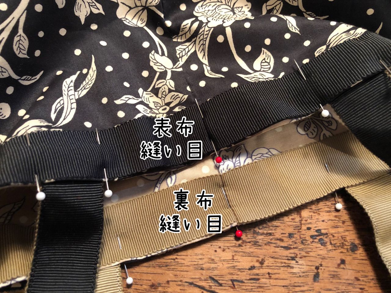 最後に袋布表と裏のバッグ口を縫い合わせる際、リボンの上からステッチをかけるので仮止めにしています。