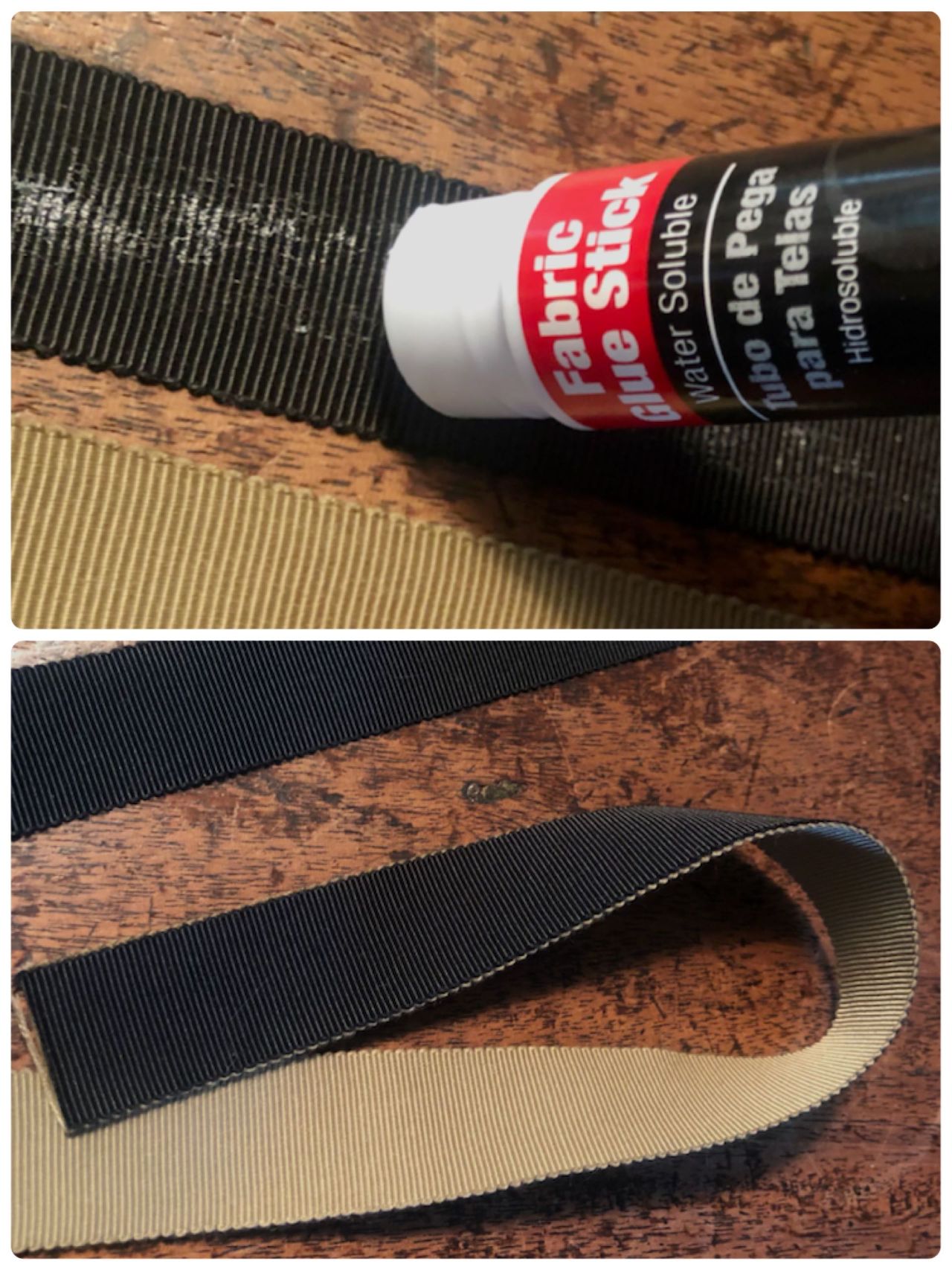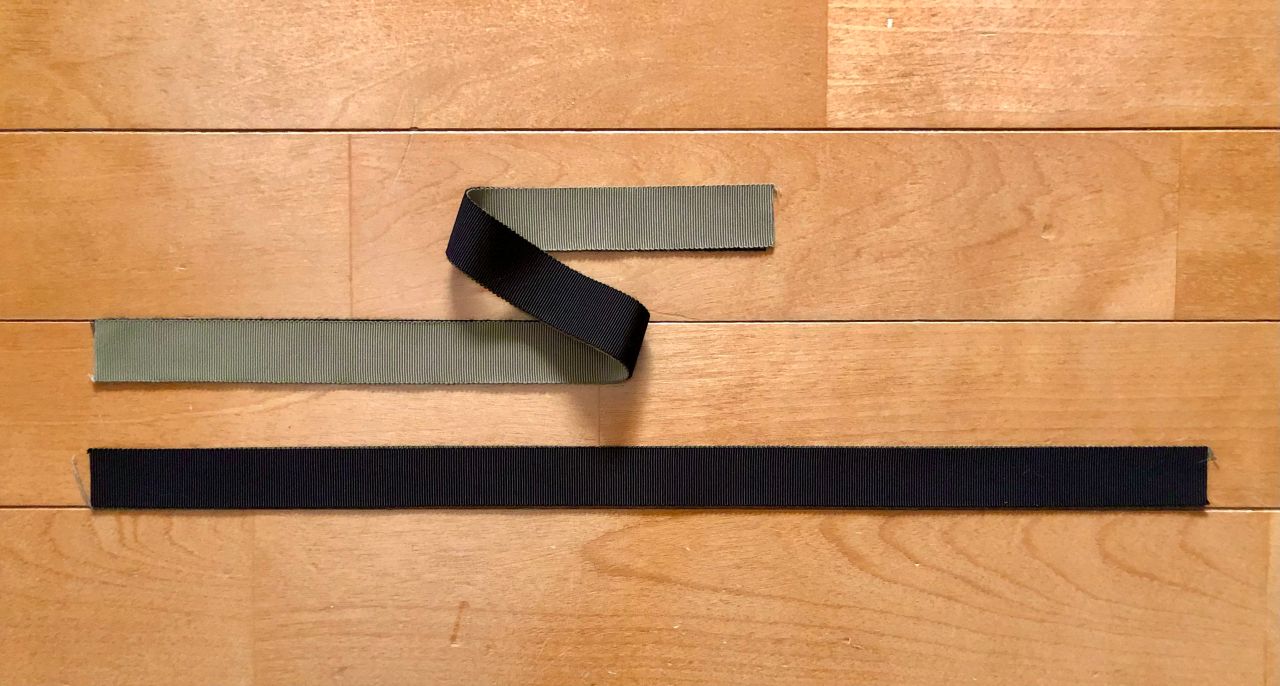 表リボン(黒)と裏リボン(ベージュ)を貼り合わせ仮止めします。