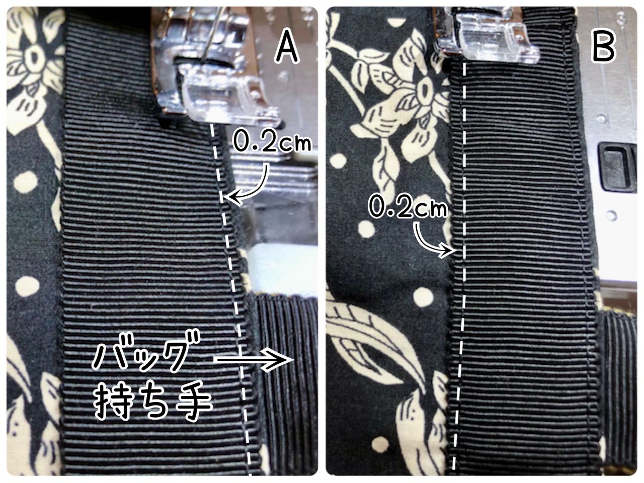 B リボン端逆側にも0.2cmで一周ステッチをかけます。