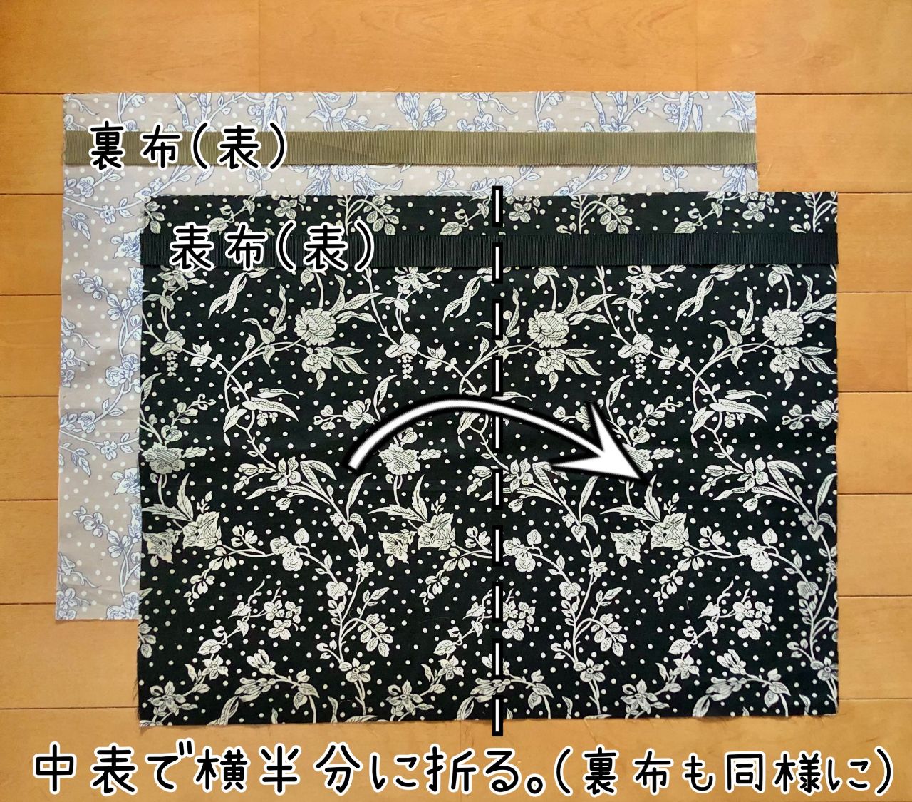 袋布を中表で横半分に折り、脇の片側を"わ"にします。